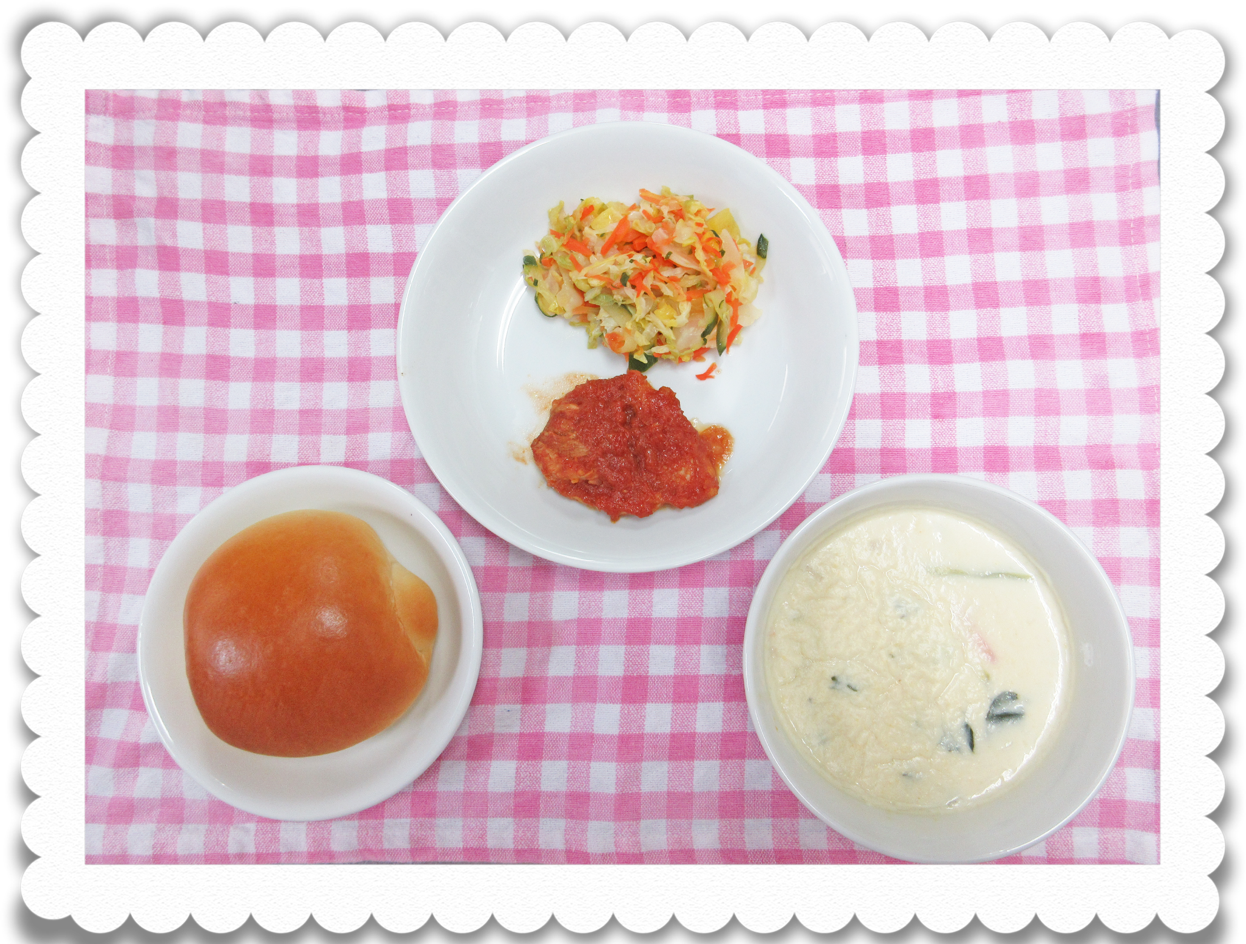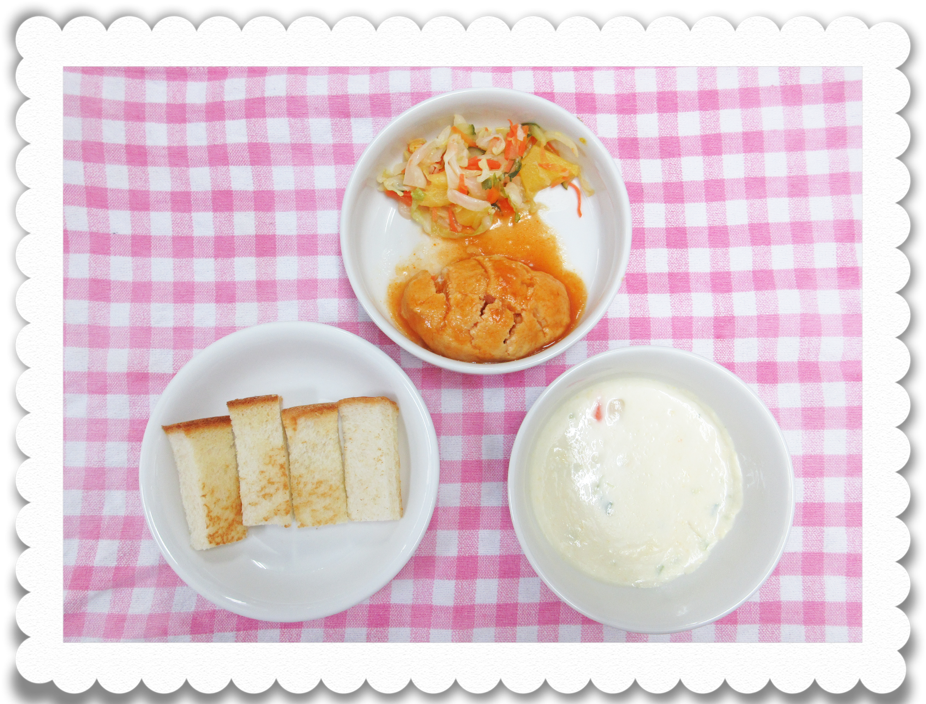 【幼児給食】バターロール、鶏肉のあけぼの焼き、ハワイ風サラダ、コーンクリームスープ