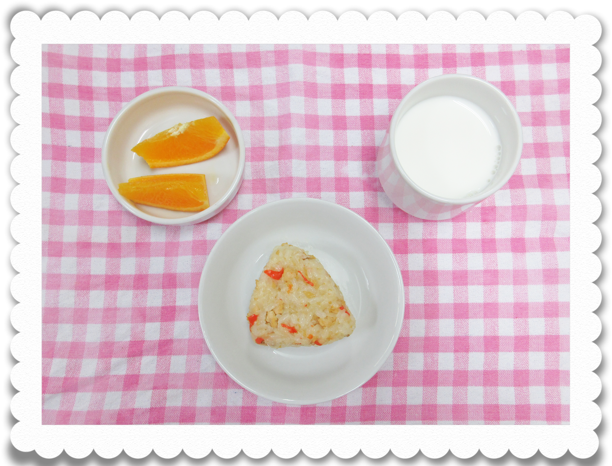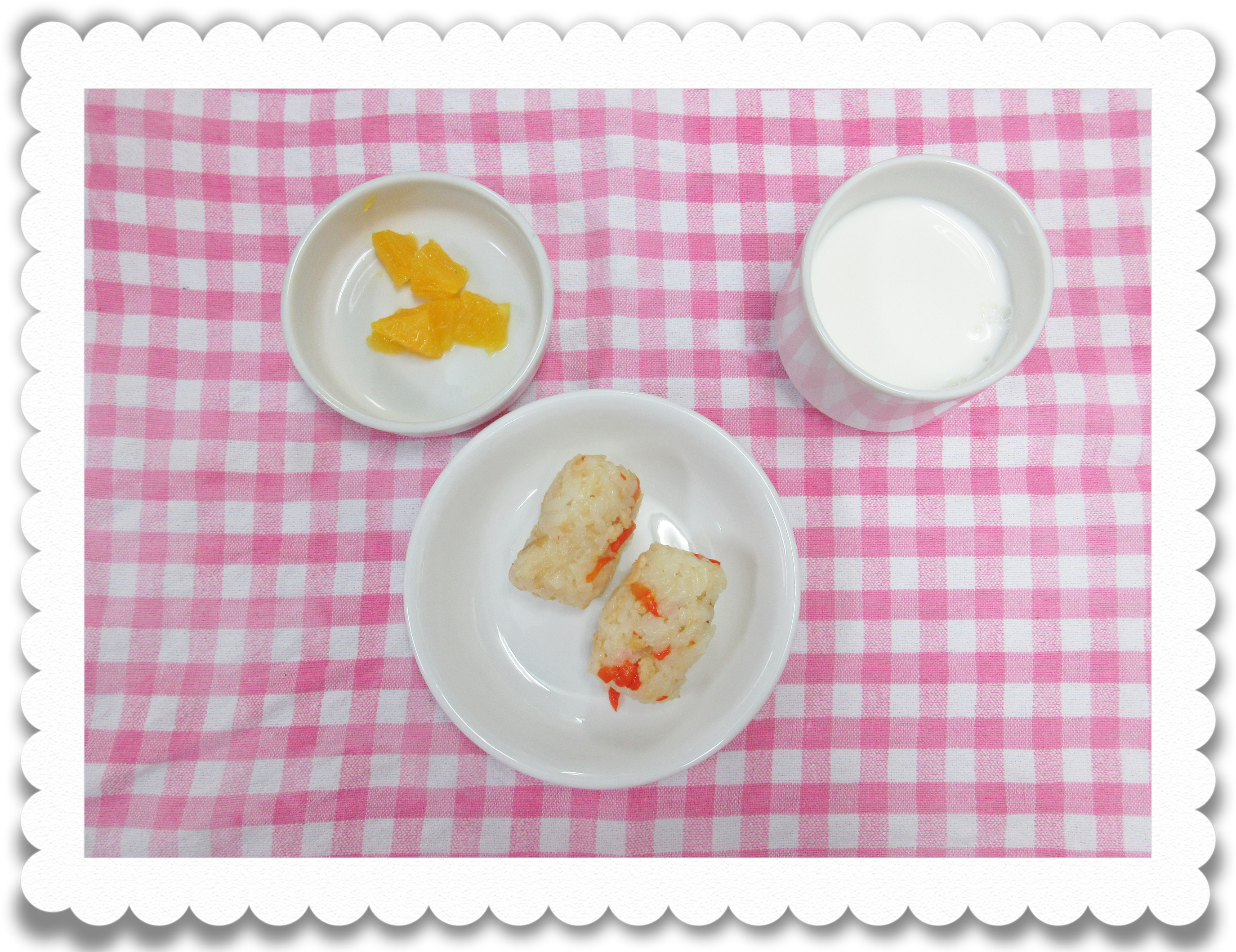 【幼児おやつ】牛乳、ビビンバおにぎり、果物