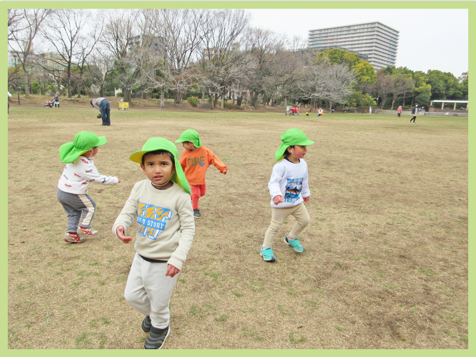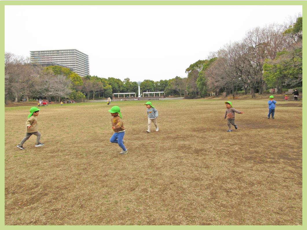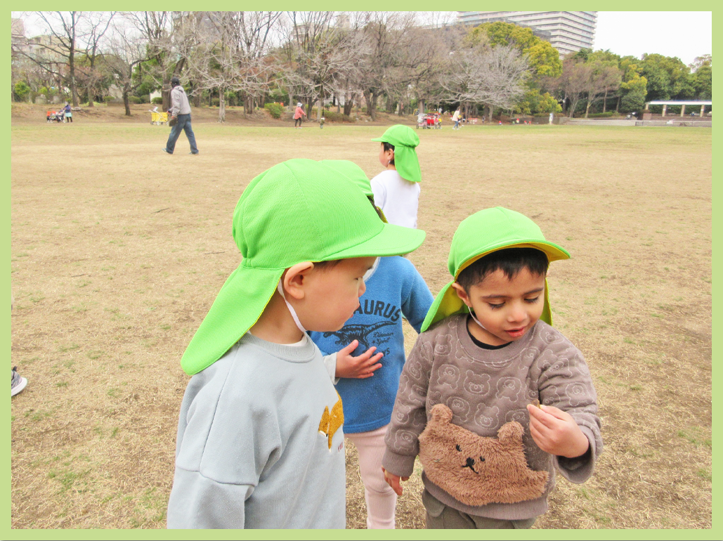 芝の広場では、追いかけっこをしたり探索したりしながら遊び、帰り道もしっかりと歩くことが出来ました。