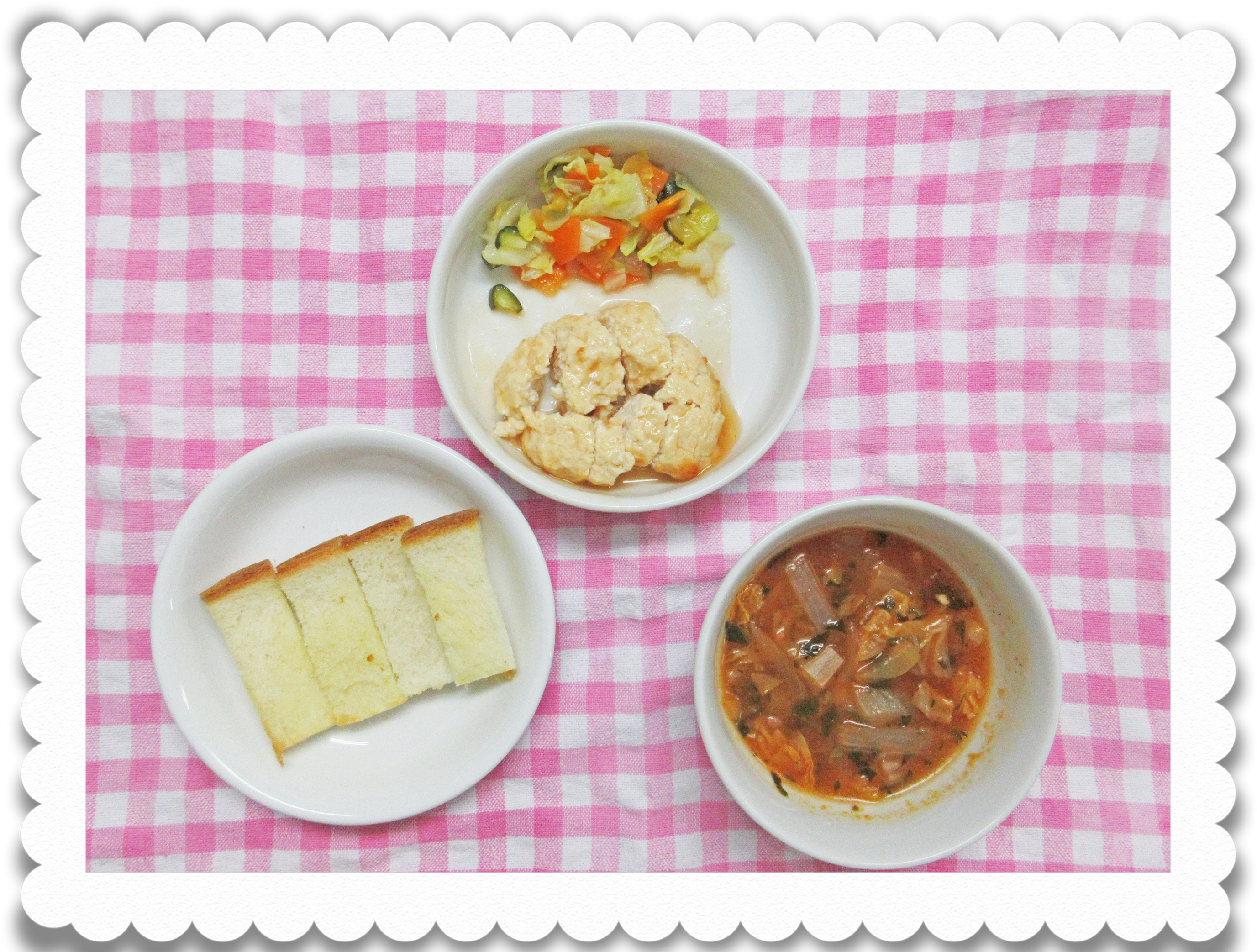 午前食:トースト、煮込みハンバーグ、ハワイ風サラダ、トマトスープ