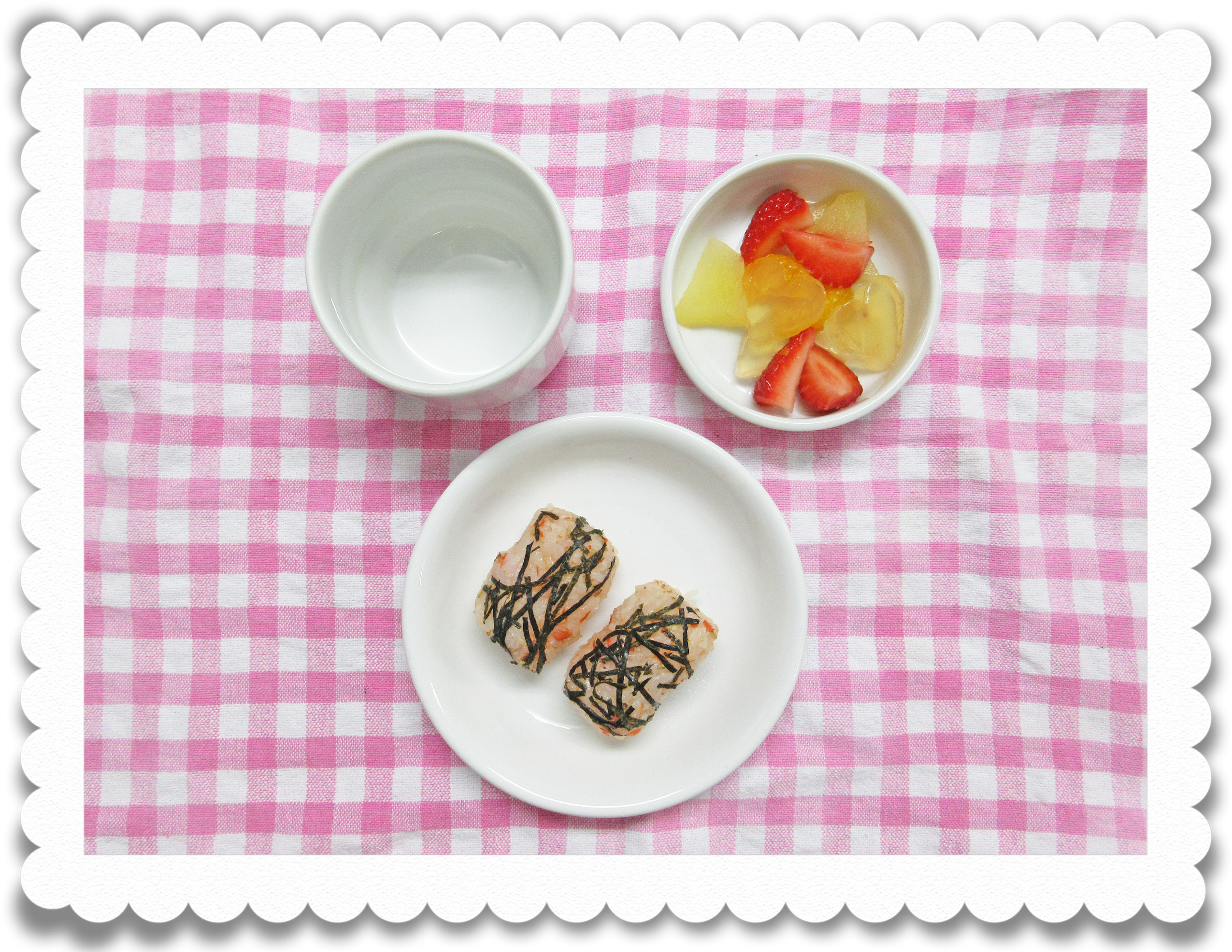 午後食:牛乳、鮭おにぎり、フルーツポンチ