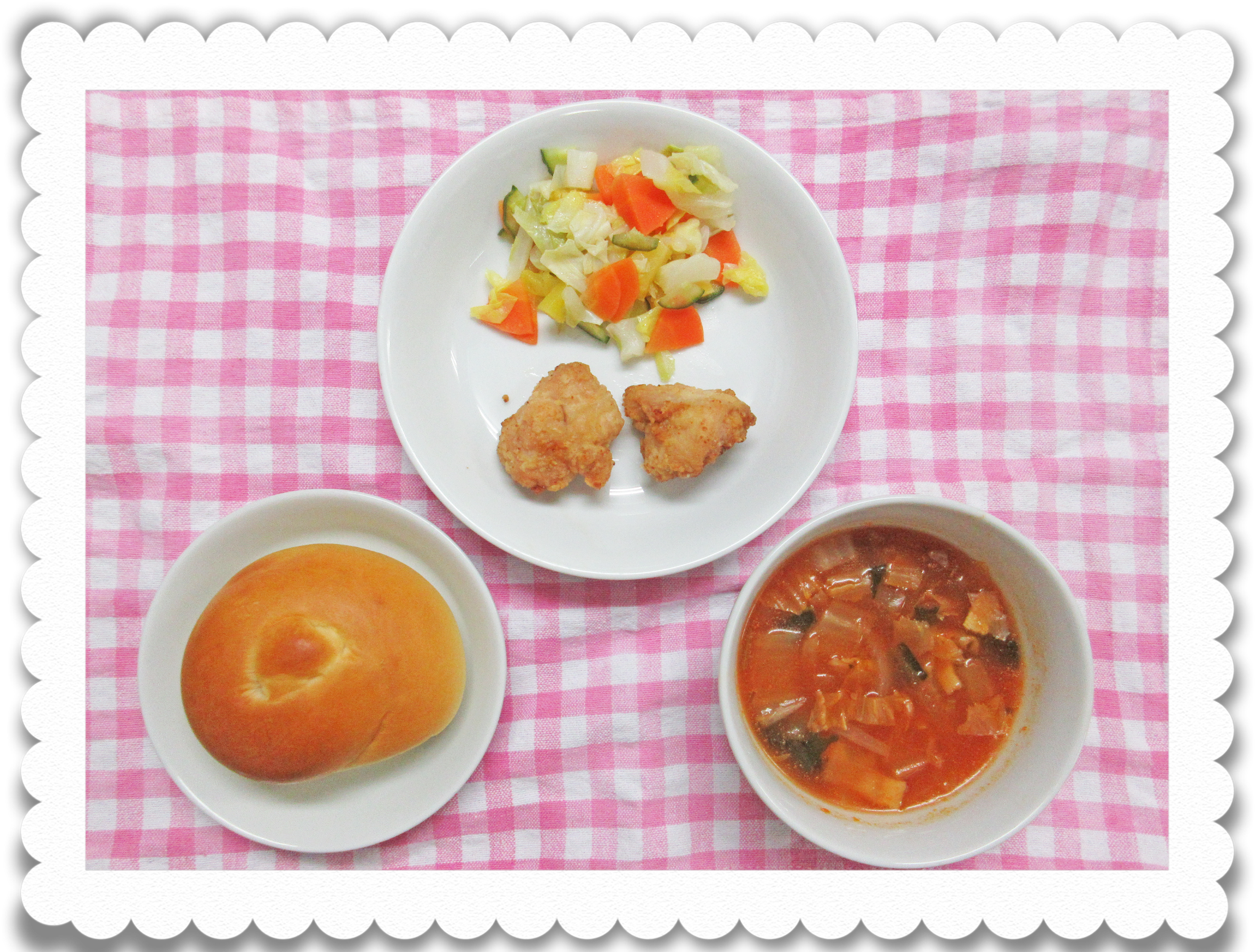 りんご天然果汁、キャベツ、はくさい、トマトジュース缶、たまねぎ、いちご、りんご、みかん缶、ホールトマト缶詰、かんてん(粉)、パイン缶、にんじん、ほうれんそう、きゅうり、焼きのり