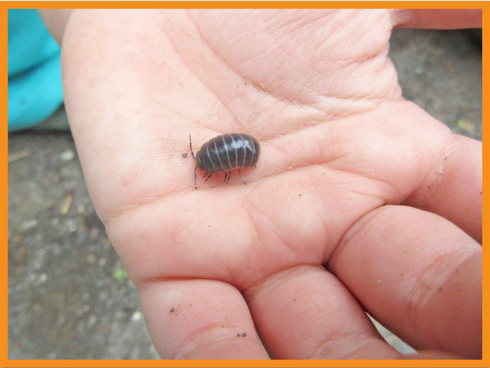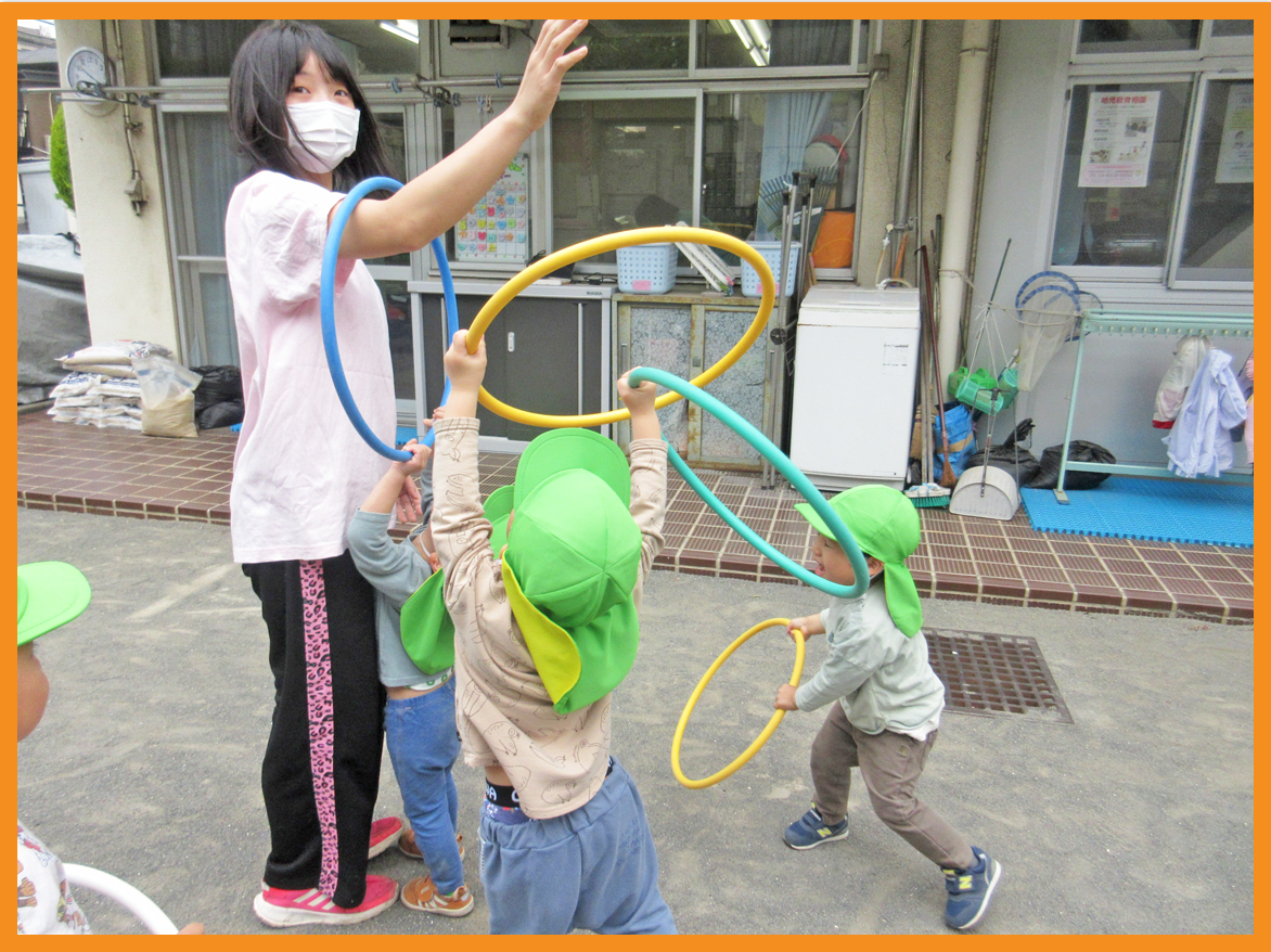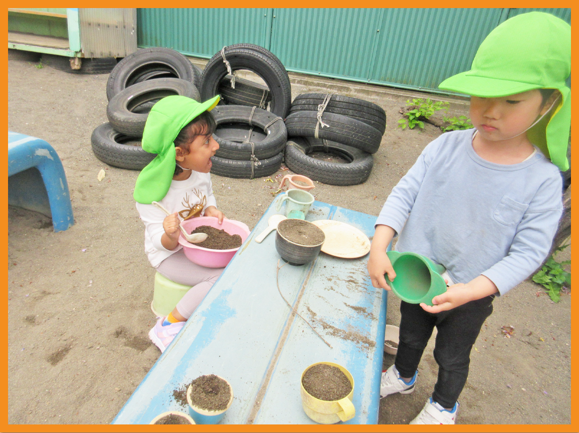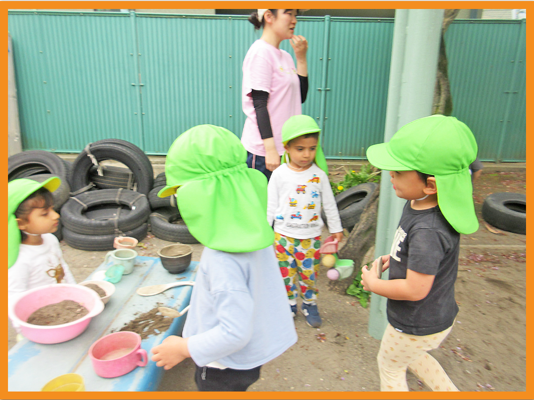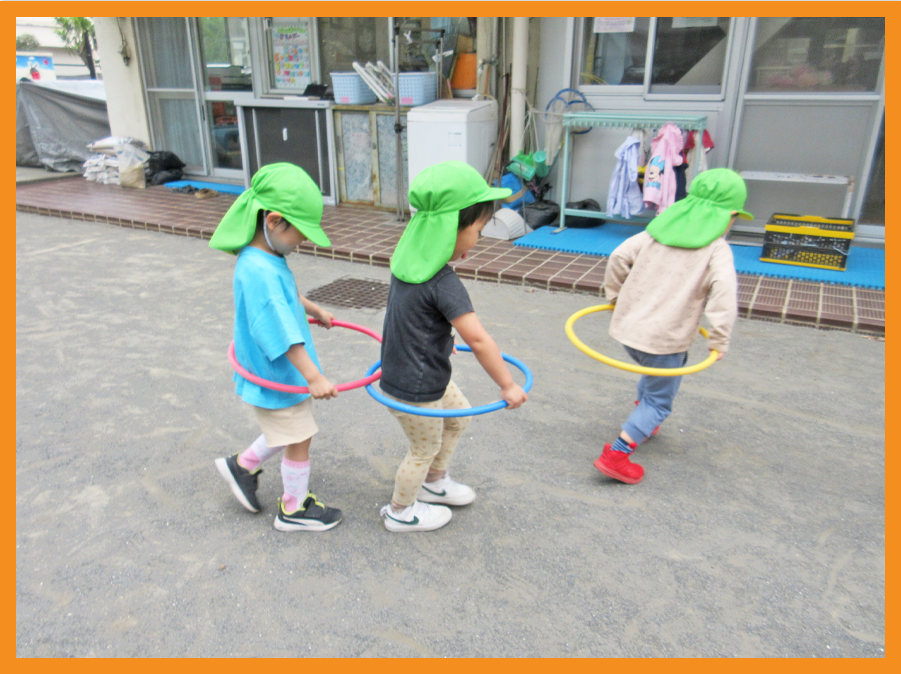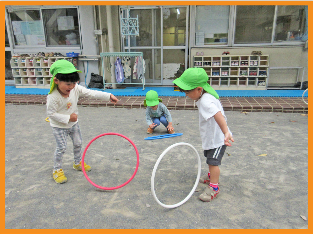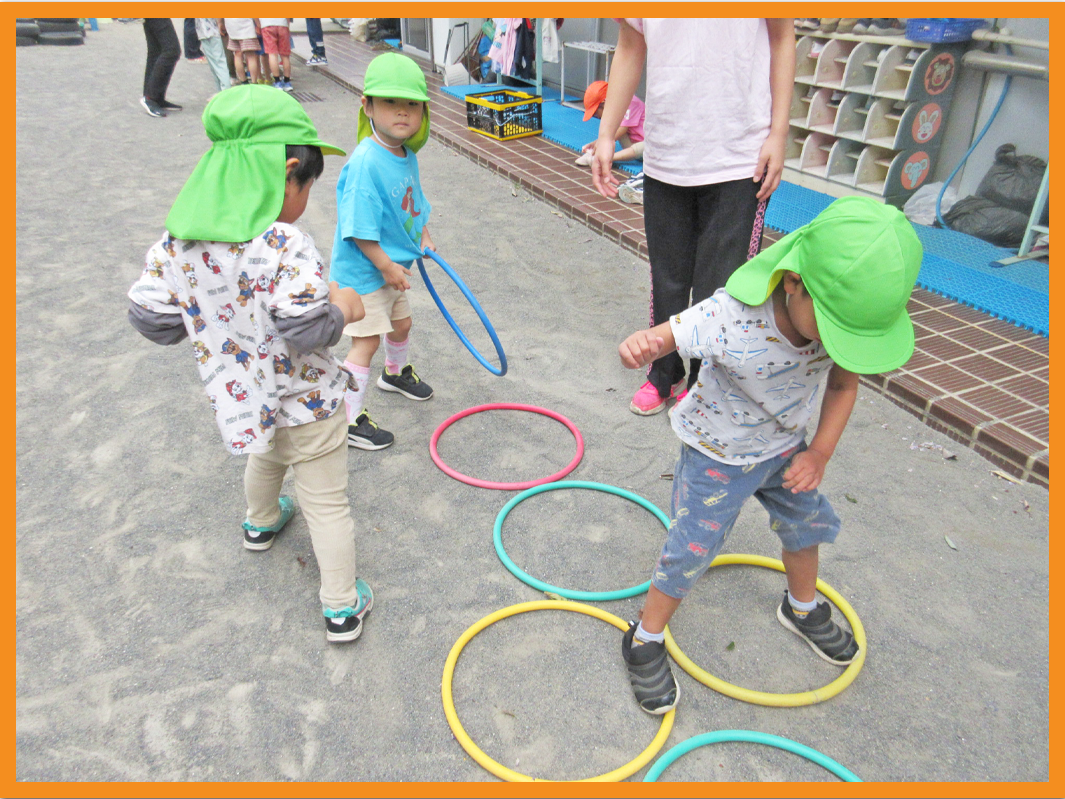 園庭に出て広い場所と砂場に分かれ、フープ遊びや虫探し、おままごとなど友だちを誘いながら遊びました。フープでは、地面でフープを回転させて友だちと比べ合ったり、電車ごっこやグーパージャンプをしたりして楽しんでいました。砂場の周りでは、ダンゴムシを見つけて大喜びしたり、お料理ごっこをしてやり取りを楽しんだりしていました。