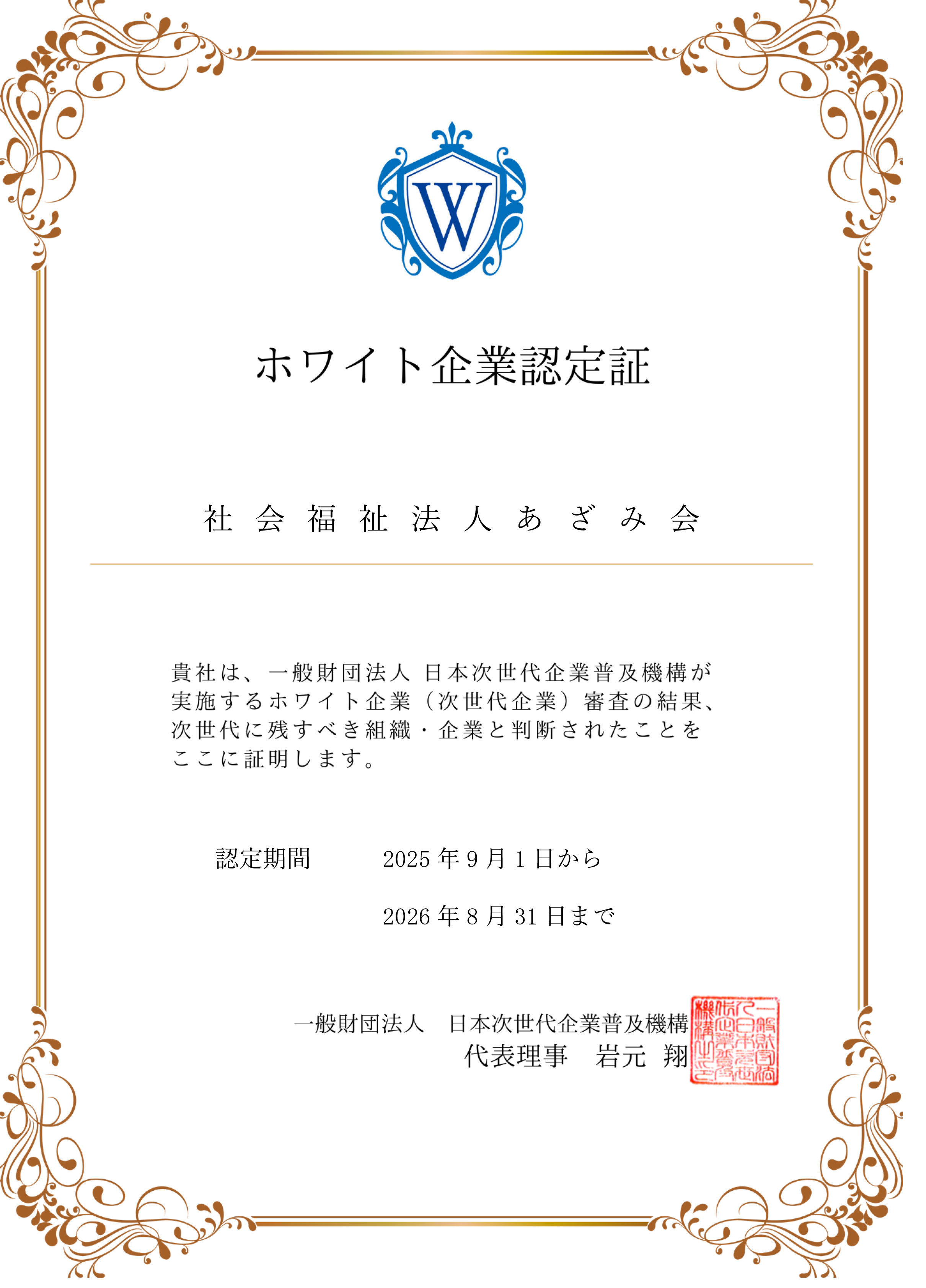 お知らせ 2025年09月24日ホワイト企業認定をいただきました2025年07月25日えるぼし認定をいただきました2025年07月01日2025年度6月の第三者委員等への相談について2025年06月04日2025年度5月の第三者委員等への相談について2025年05月15日田植え体験の動画を更新しました ホワイト企業認定をいただきました ホワイト企業認定とは 企業のホワイト化を総合的に評価する、国内唯一の認定制度。