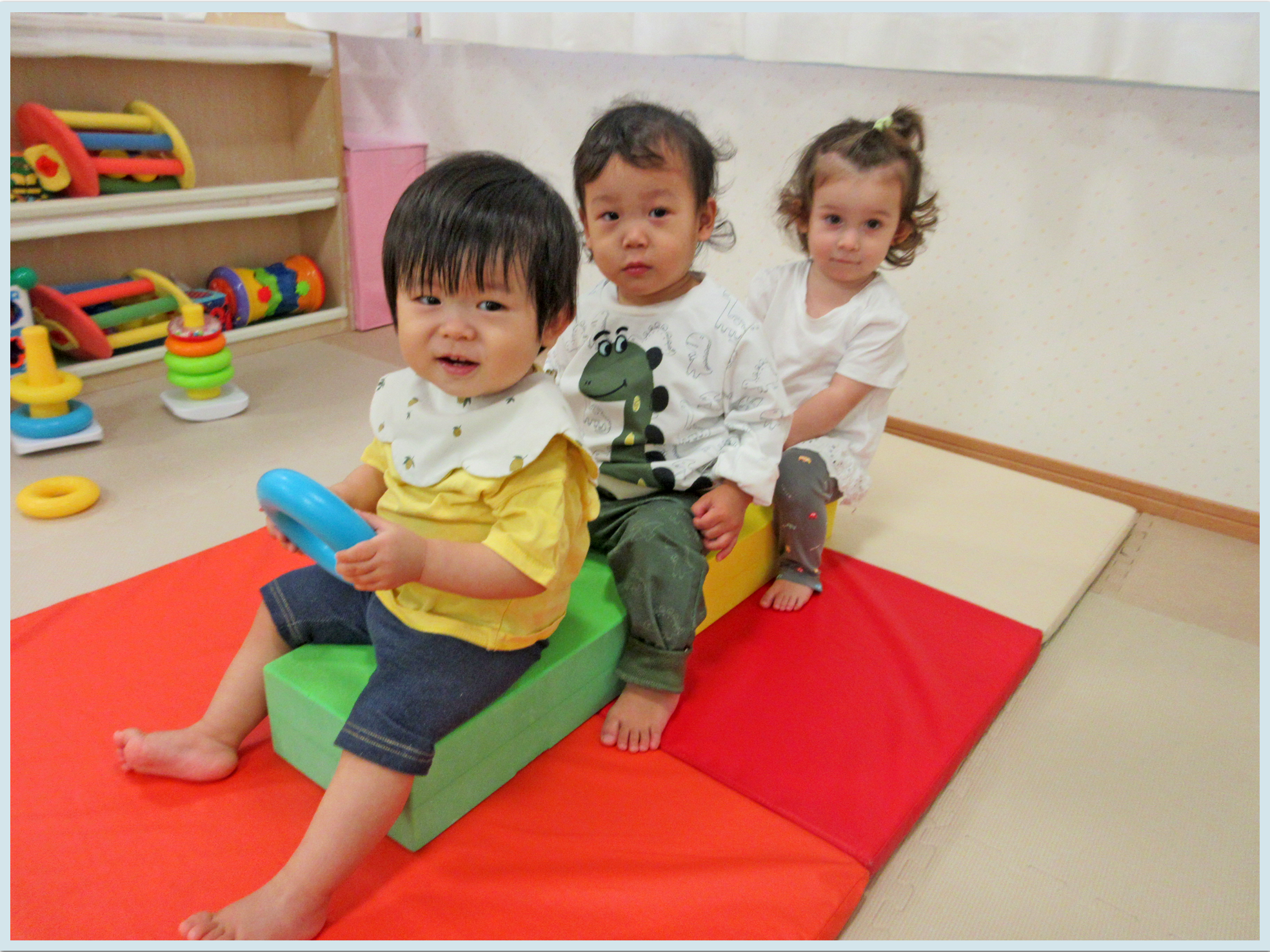 マット遊びでは形を変形させながら遊んでいくうちにブロックを上に置いてのバスごっこに発展し、皆で思いきり楽しみました。保育者の歌に合わせて体を揺らす様子が可愛らしいです♪