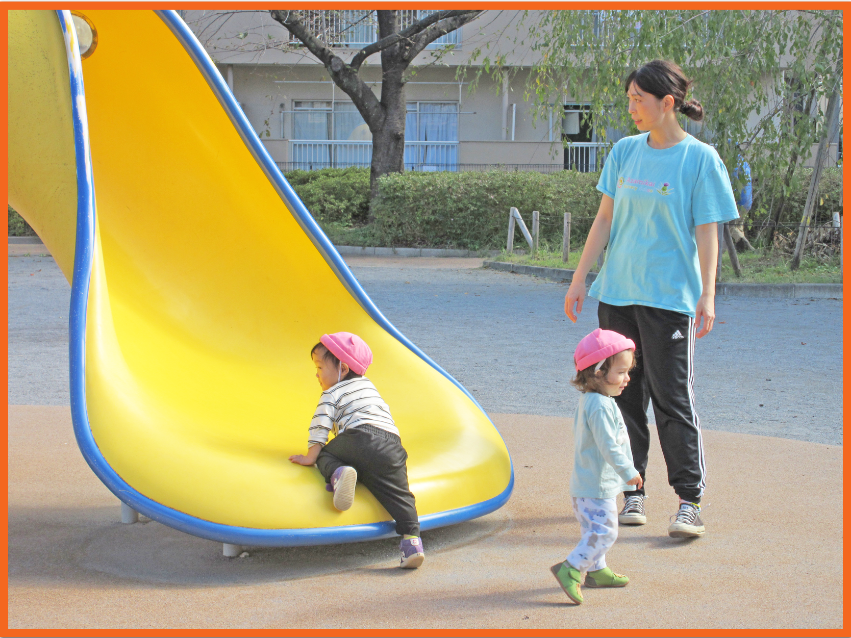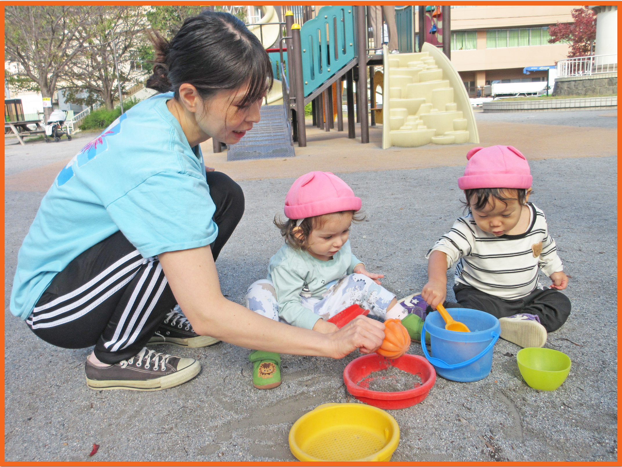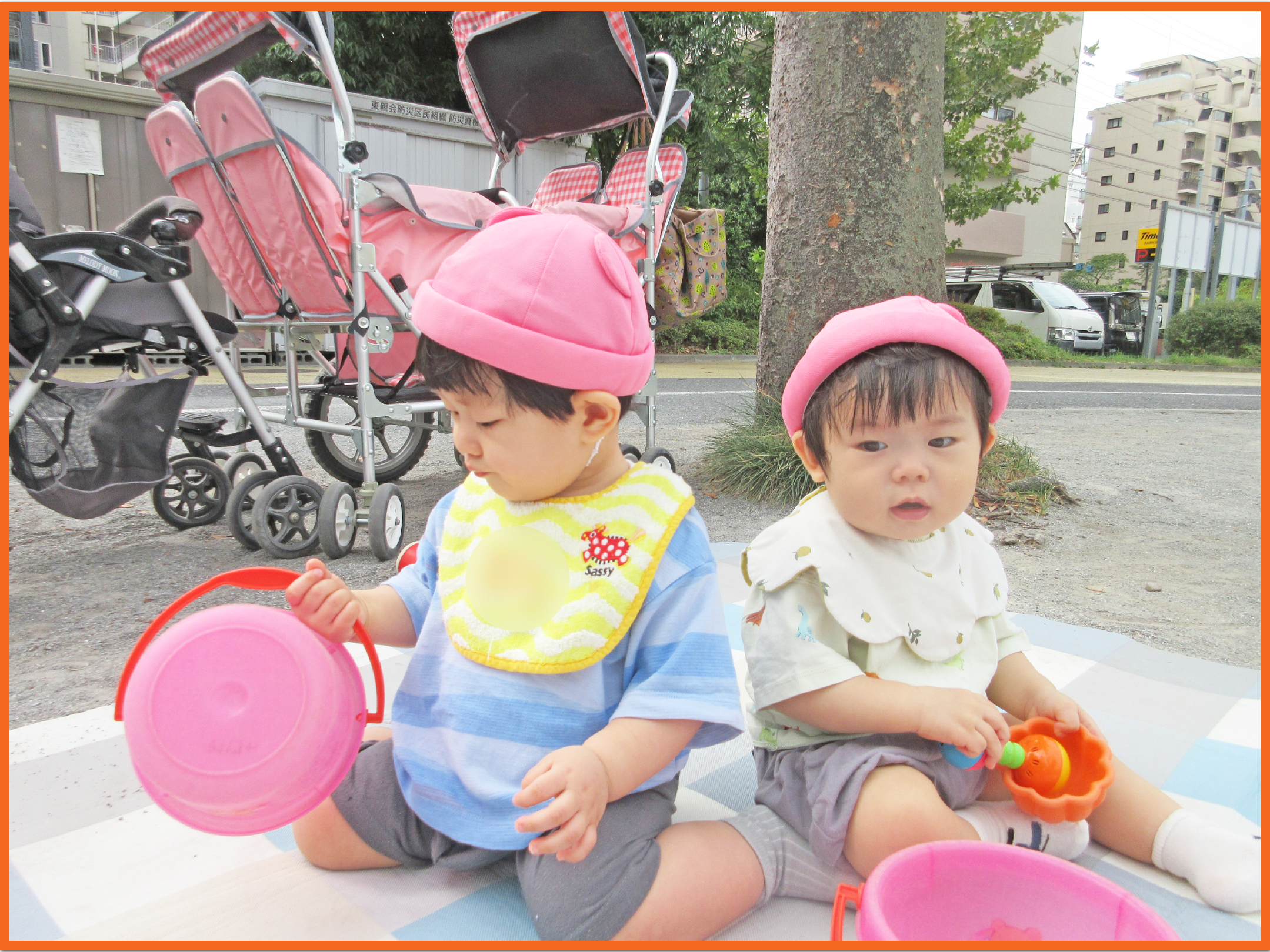 公園で探索遊びを楽しみました。金木犀の木の近くにレジャーシートを敷いて音の出る玩具で「おもちゃのチャチャチャ」や「トンボのめがね」を歌って遊びました。金木犀の良い匂いが風に乗って感じられたりトンボが飛んできたりして身近な秋の自然を楽しんでいました。また、歩行が出来るようになったこどもたちは保育者と滑り台や船の遊具を見に行き、探索を楽しんでいました。