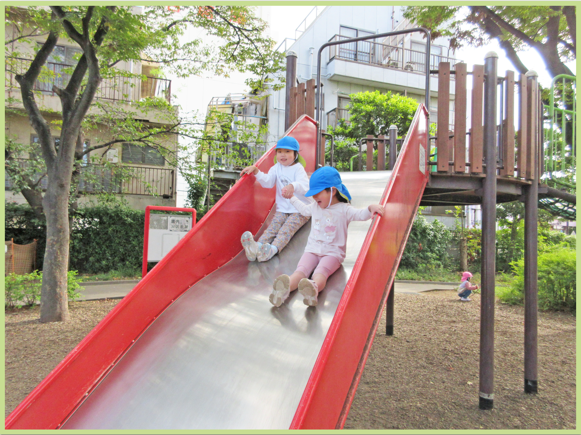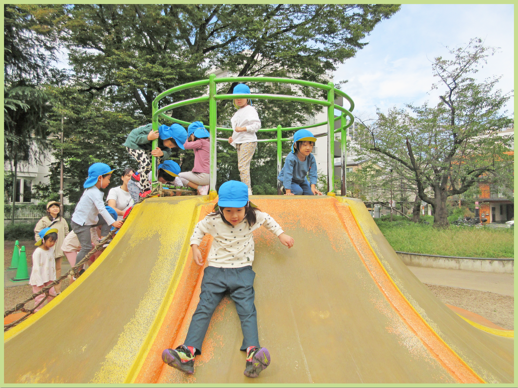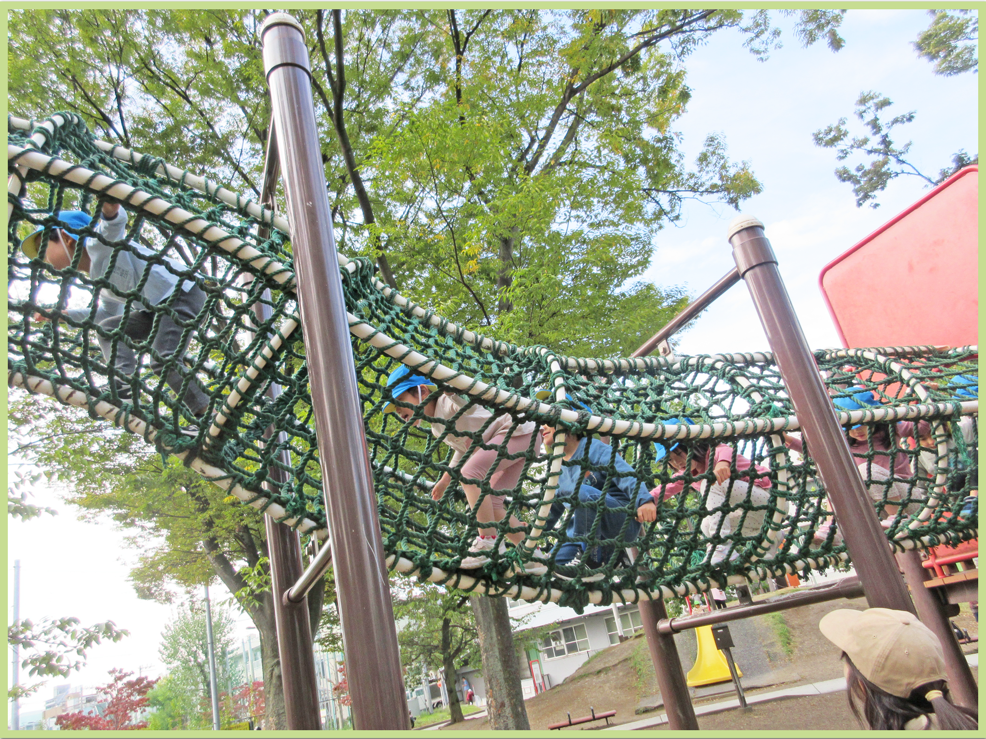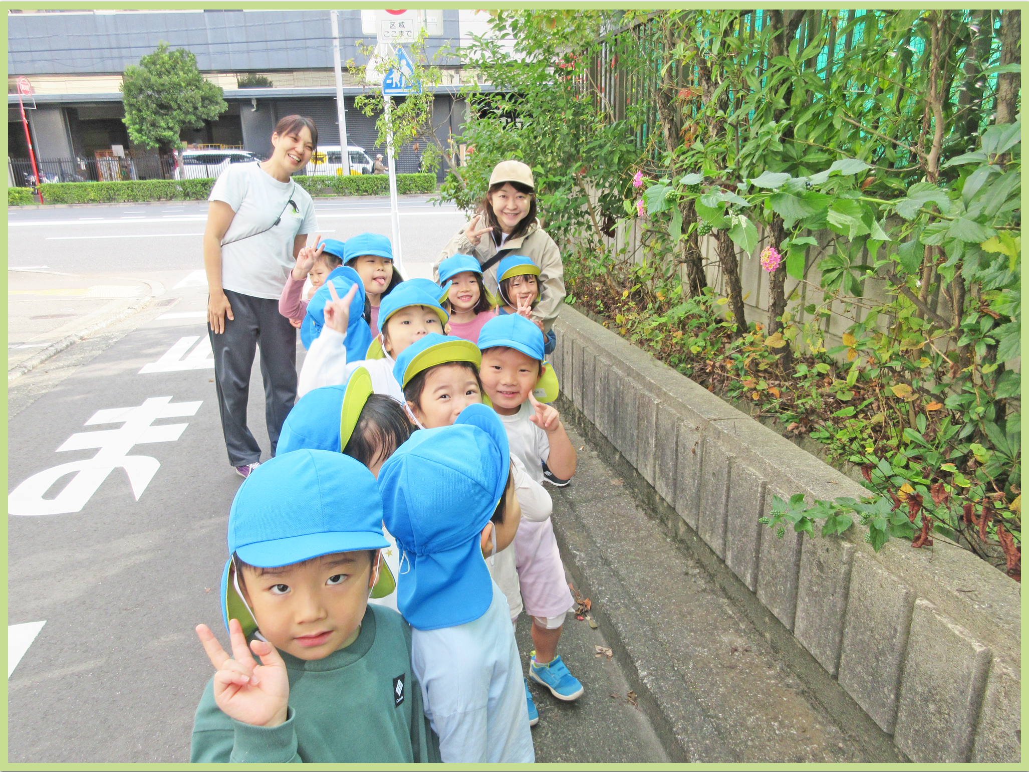 すると、高校の近くでランタナという花を見つけ、とても嬉しそうにしていました。公園では、プリンの滑り台と大型遊具で遊びました。友だちと順番を守って楽しそうに繰り返し滑って遊んでいました。大型遊具では、吊り橋が怖くてなかなか前に進めない子もいましたが、自分が楽しめる遊具を見つけて楽しそうに遊んでいました。帰りも植物を探しながら歩いていると、まだ紅葉していないモミジやイチョウ等を見つけました。今日見つけられなかった植物は、次回探したいと思います。