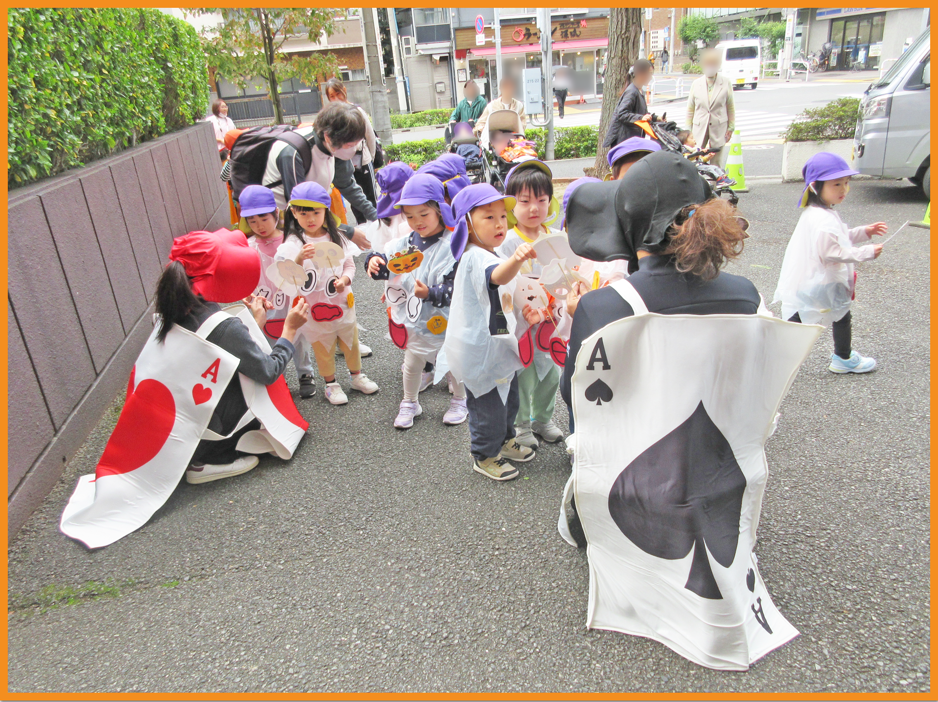 自分たちで作った衣装を着たり、かわいいい飾りをつけたりして町会会館に向かいました。