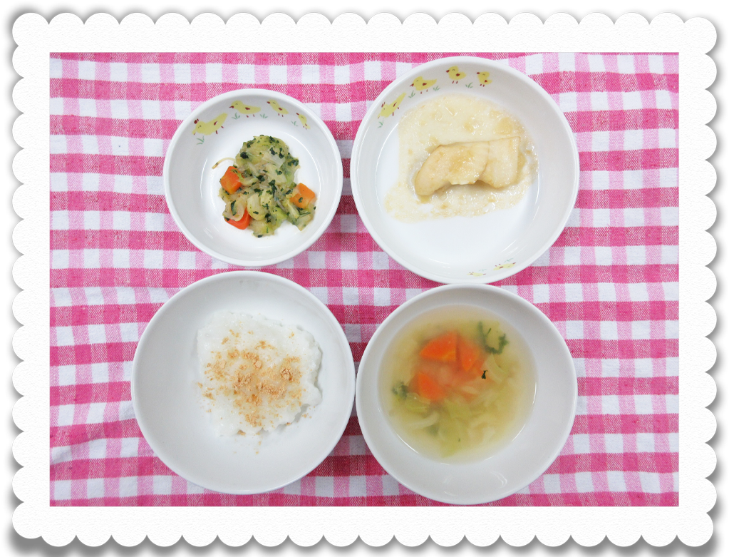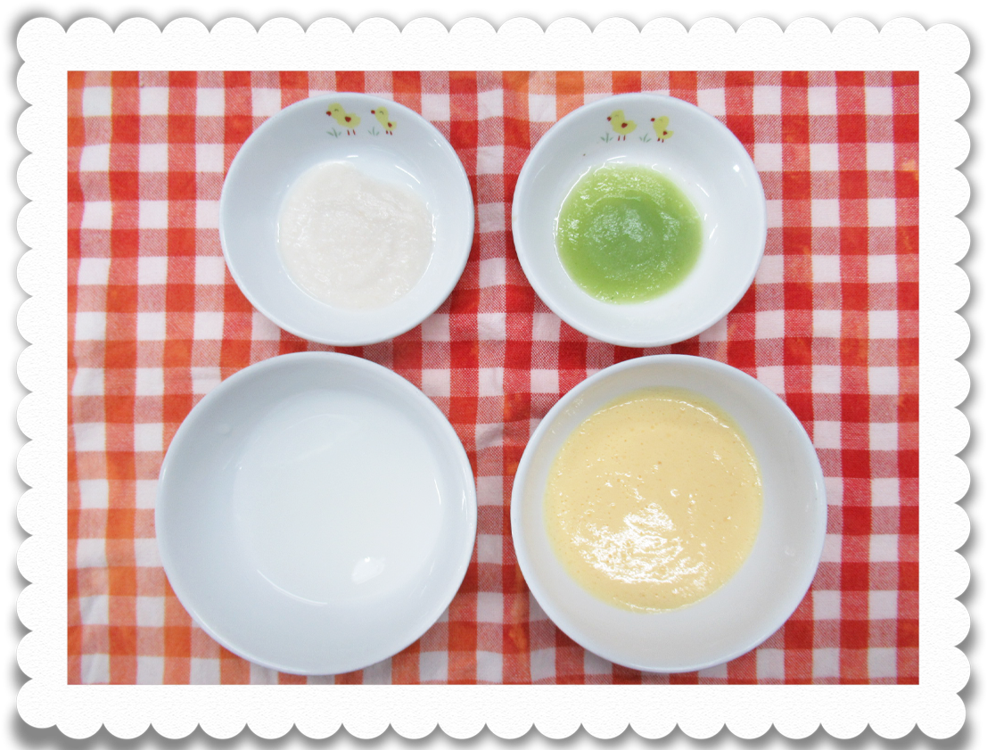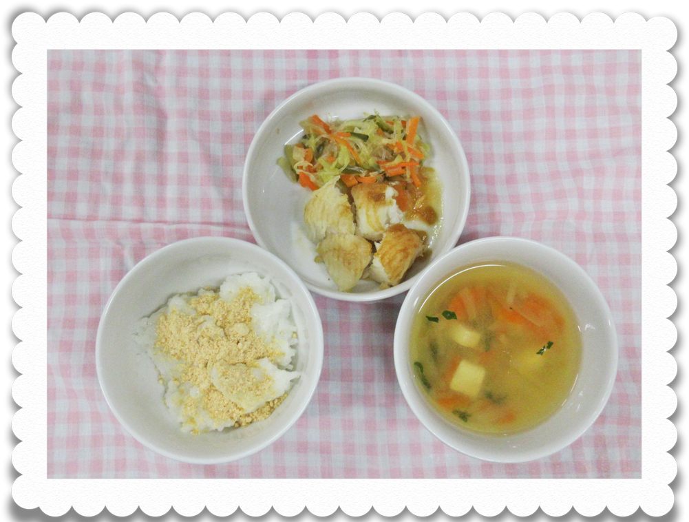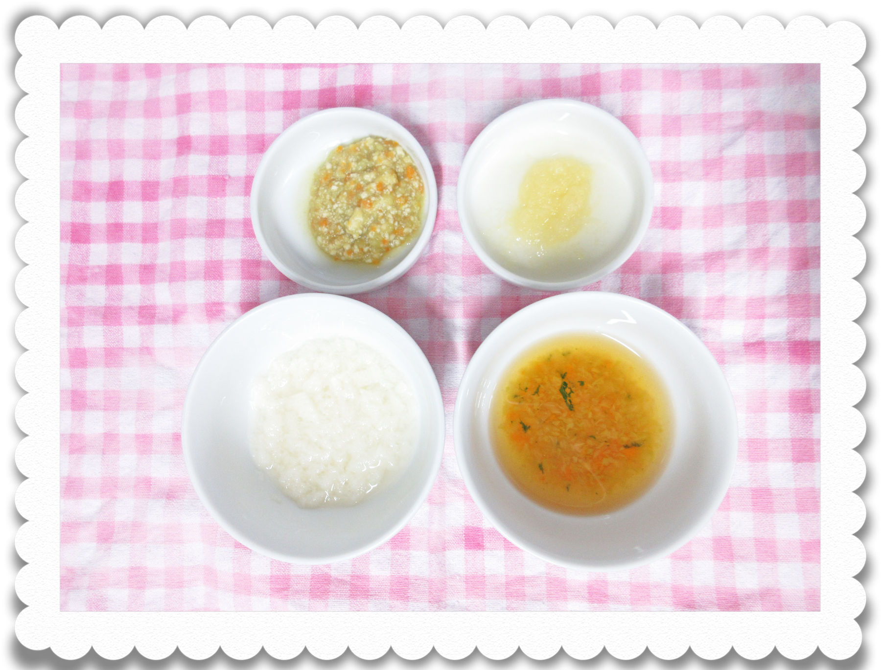 午前食:10倍粥、白身魚のペースト、野菜のうらごし、人参スープ