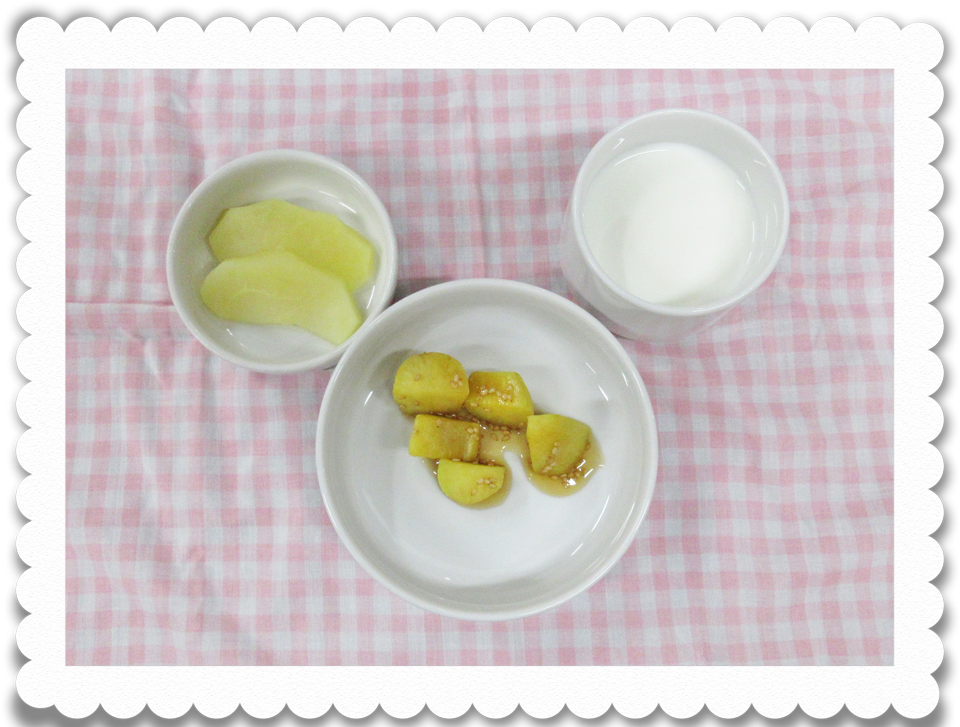 午後食:スープパン粥、さつま芋のつぶし煮、野菜スープ、果物