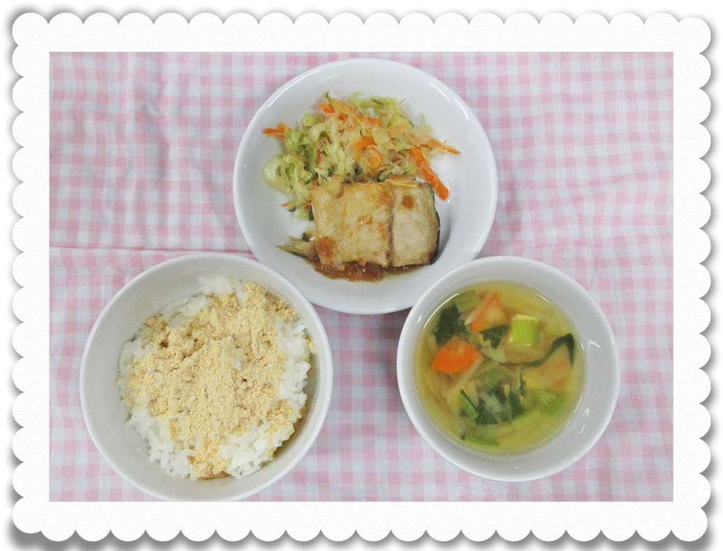 【幼児給食】きな粉ご飯、鯖のねぎソース、焼きバンサンスー、みそ汁