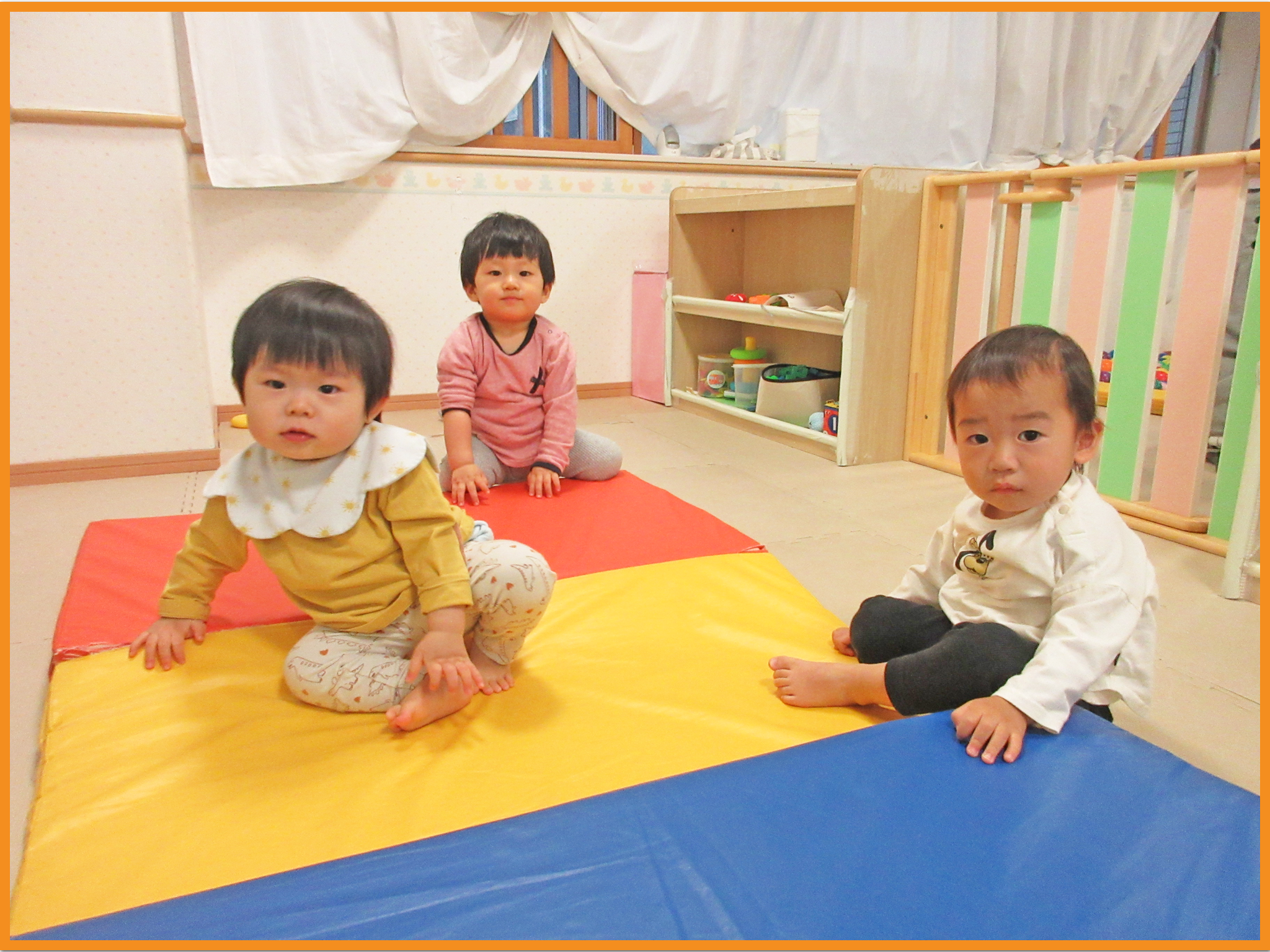 今日は、保育園体験の方が遊びに来てくれたので、一緒に室内でマット遊びとボールプールで遊びました。最初はマットを平らにしながらその上を歩行や這い這いで進んでいき体を動かしていましたが、しばらく遊んだ後に形を変化させてトンネルや山越えのように斜面を作って遊びました。トンネル遊びでは、こどもたちが自分から中に入っていき。反対側にいる保育者や友だちに「ばぁ」と顔をのぞかせてニコニコの笑顔を見せていました。山越え遊びでは、足腰に力を入れてバランスを取り元気に遊べていました。ボールプールでは、ボールをつかんで「ポーン」と投げたり、追いかけたりしている姿が見られました。保育者がボール色を「あか」「あお」など「りんごがゴロゴロ」の歌に合わせて実物を見せて伝えると興味津々に見ていました。
