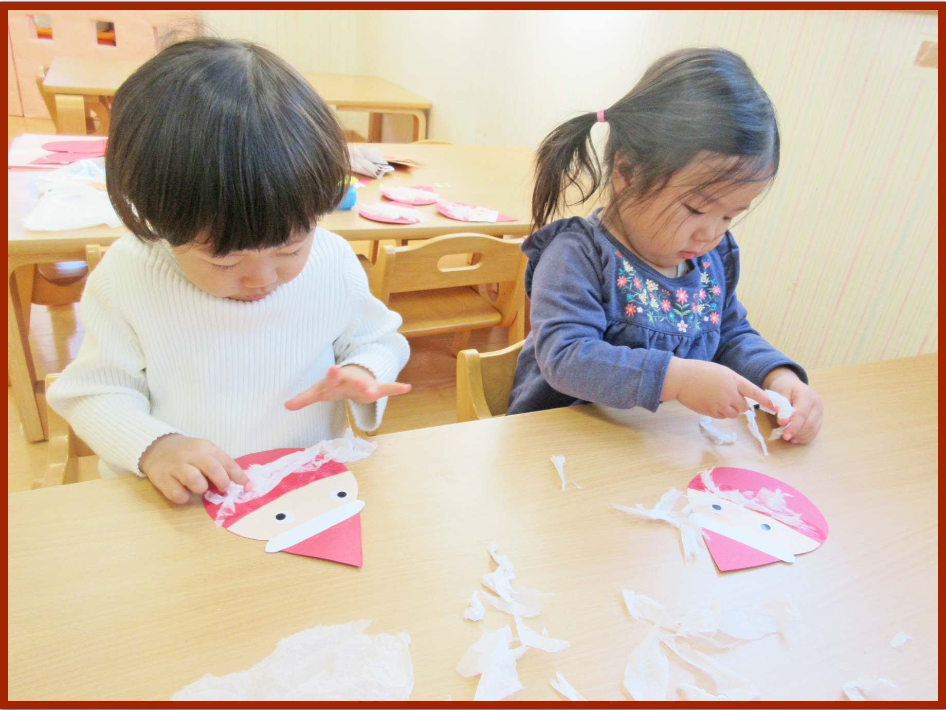 12月の製作を行いました。サンタさんのおひげは、花紙をちぎって糊で付けて再現しました。花紙を小さく上手にちぎって、「ここにつける」「ぺったんしたよ」などとお話ししながら、とても素敵なサンタさんが完成しました。みんな楽しんで製作を行っていました。