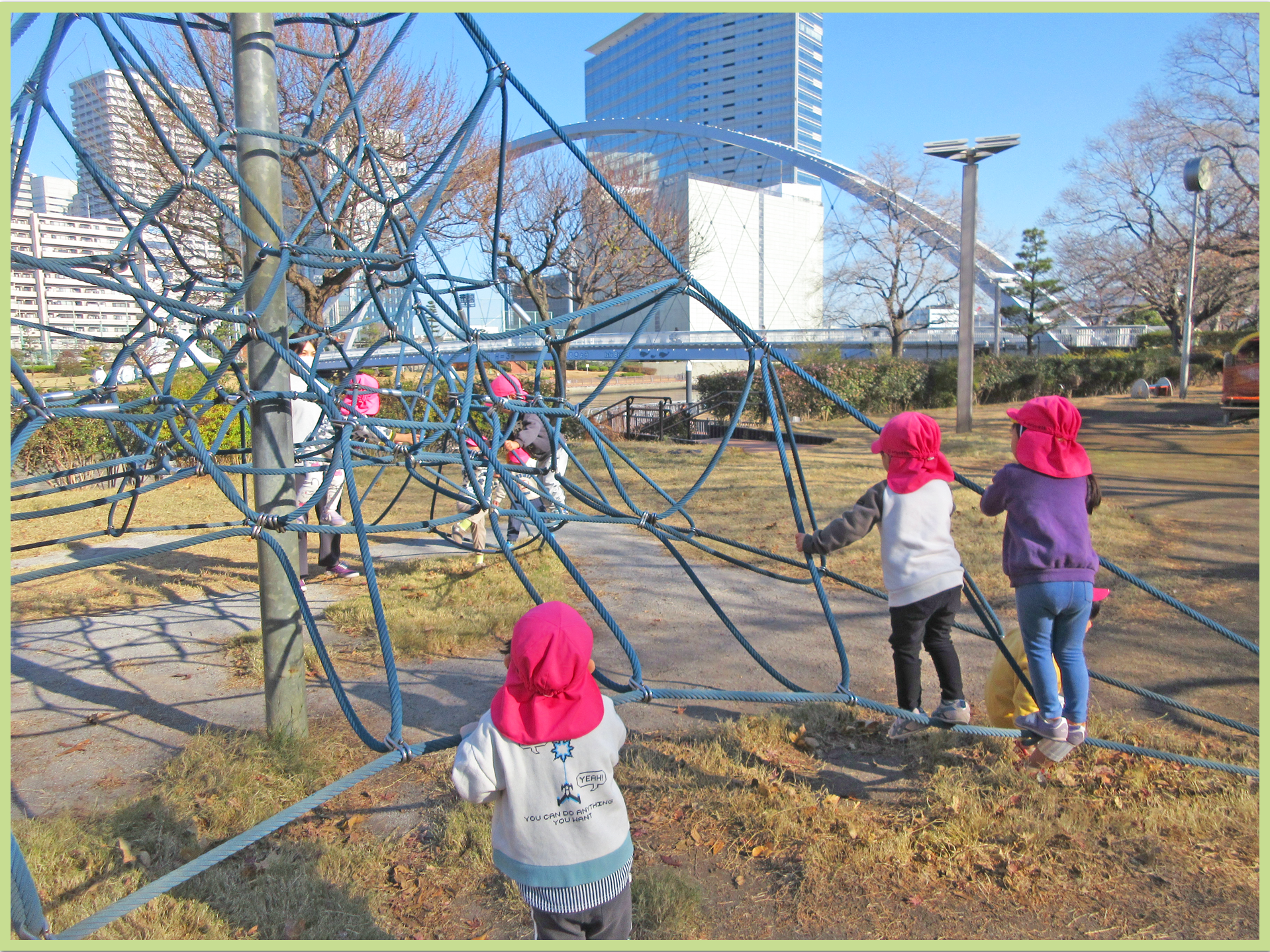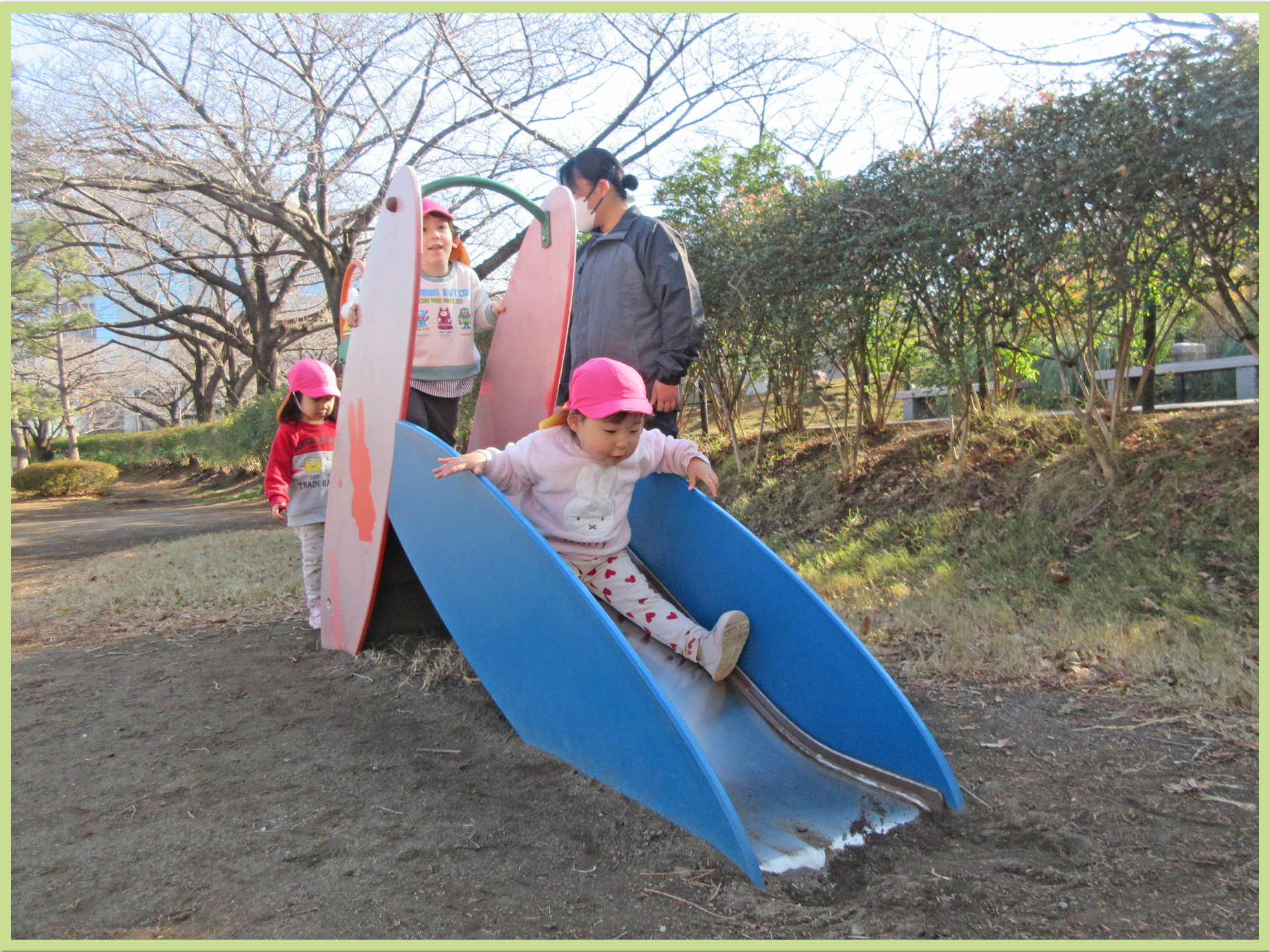 到着すると「何をしてあそぼうかな」とわくわくした表情を見せるこどもたち。ピラミットタワーでは、「登れるよ」と保育者に伝え、挑戦していました。登ることができると、「やった」と言いながらとても嬉しそうにしていました。築山では、根っこを「かぶ」に見立てて「うんとこしょ、どっこいしょ」とみんなで言いながら「大きなかぶ」遊びを始めたり、好きな遊具遊びをしたり、元気いっぱいに遊びました。