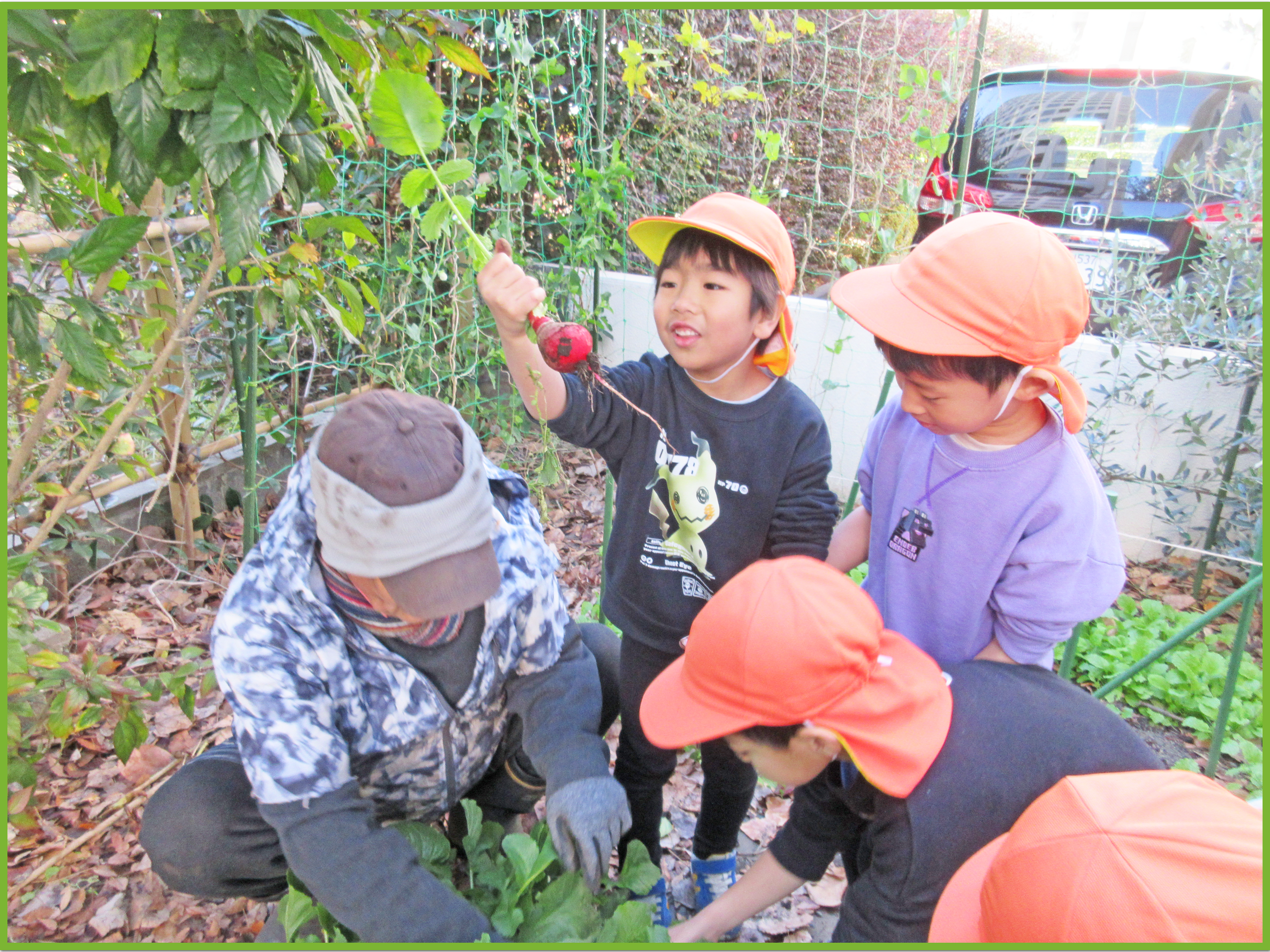 今日はそら組とたいよう組でゆうゆうプラザへじゃがいも掘りに行きました。みんなで植えたじゃがいもがどのくらい育ったか興味津々のこどもたち。たいよう組が行っている間そら組の子は「どのくらい大きいのかな」等と会話しながら楽しみに待っていました。実際に掘る際には、ゆうゆうプラザの職員の方がある程度掘り起こしてくれたので、こどもたちは土から出てきたじゃがいもを見つけて「あった、あった」と喜びながら収穫していました。その後は、ラディッシュと大根を収穫させてもらいました。一人一株ずつ収穫体験ができて、とても嬉しそうでした。保育園に戻ってからは、収穫した大根、ラディッシュ、じゃがいもをテーブルの上に並べて重さを比べたり、大きさや葉の違いを観察したりしました。