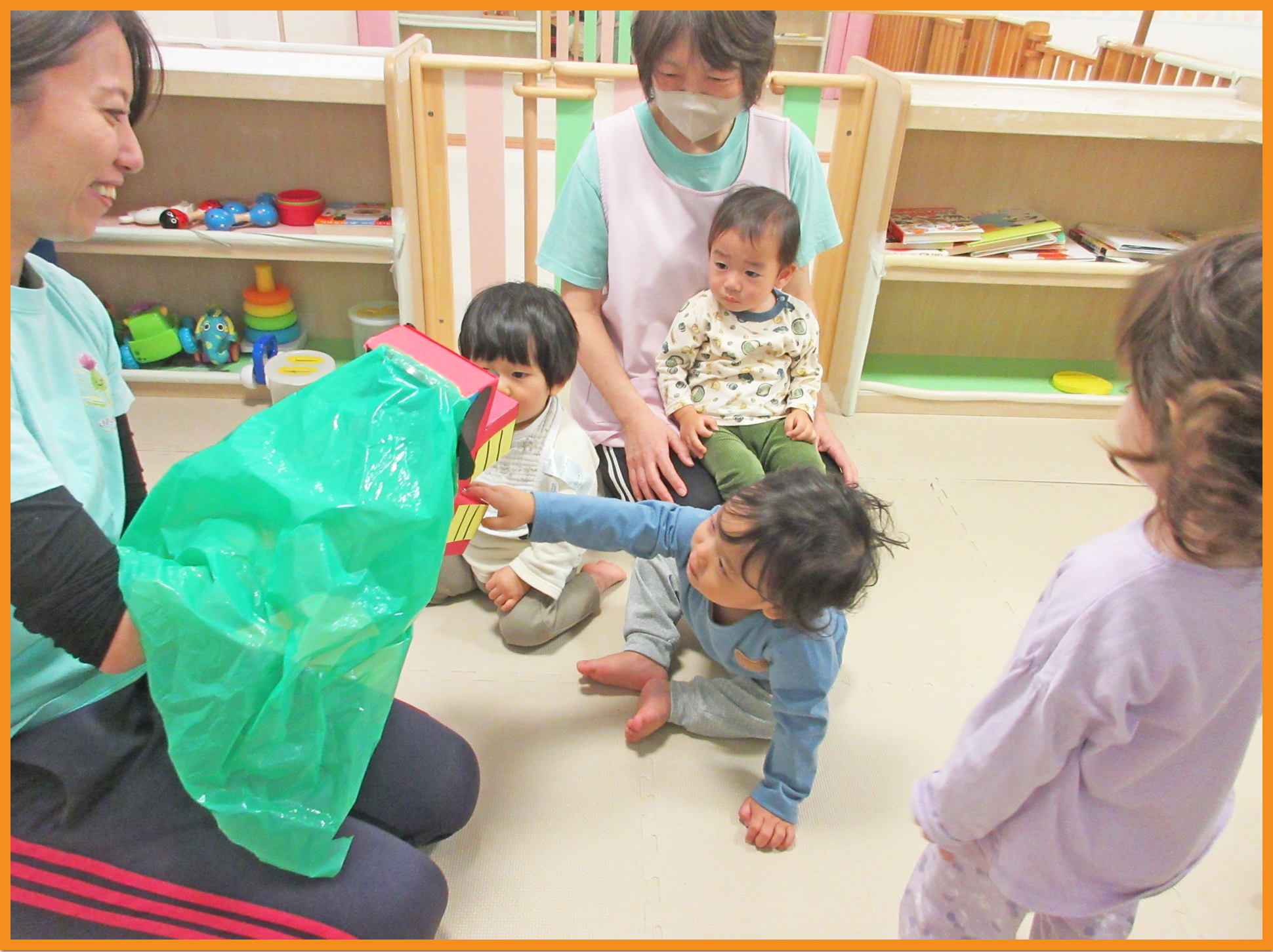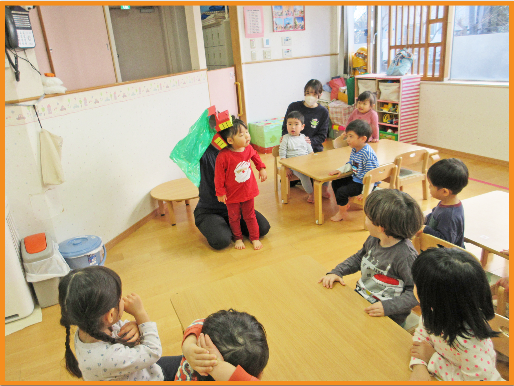 新年お楽しみ会を行い、初めに十二支の成り立ちに関するパネルシアターをしました。十二支の順番を覚えているこどもも多く「つぎは、〇〇だよ」と、教えてくれる姿が見られました。お正月クイズでも、質問の内容が面白かったようで大笑いで最後まで楽しみました。乳児クラスのお友達は、各クラスでミニ獅子舞と触れ合いました。