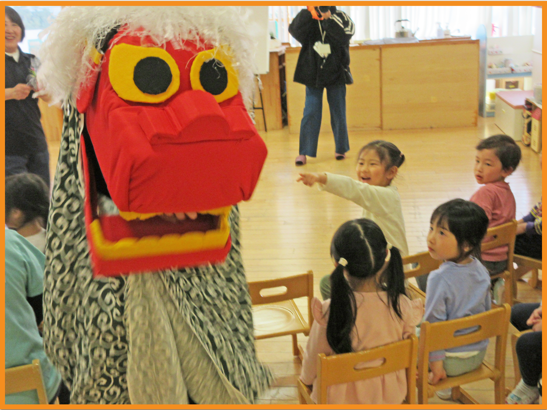 幼児クラスのお友達は、大きな獅子舞と接し「あたま、かんでいいよ」と興味津々の様子でした。その後は、各クラスに戻りコマやカルタ等、お正月遊びを行いました。