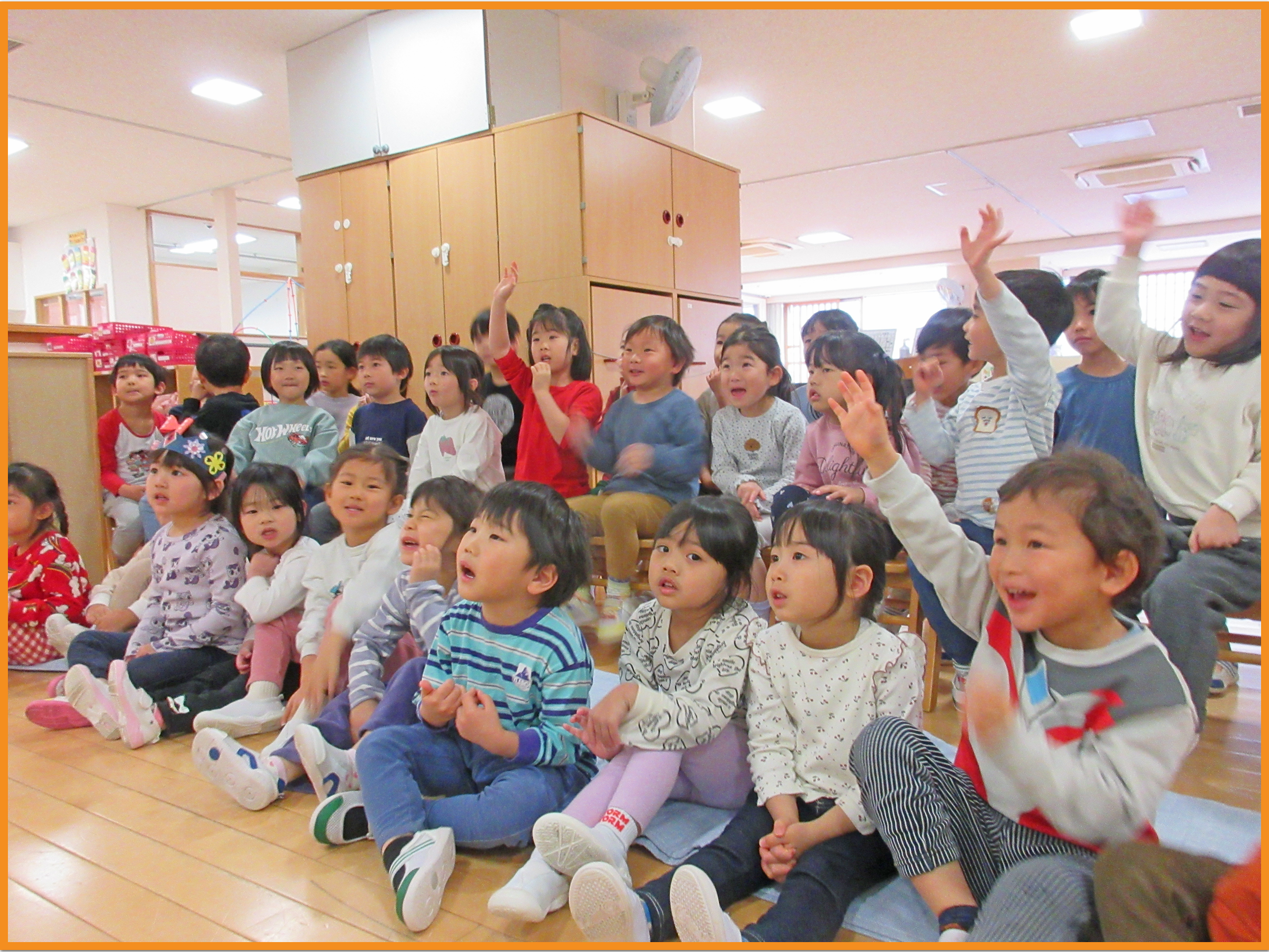 乳児クラスはパネルシアターに出てくる雲の形が、何の食べ物なのかみんなで考えながら楽しみ、幼児クラスは三択クイズで盛り上がりました。