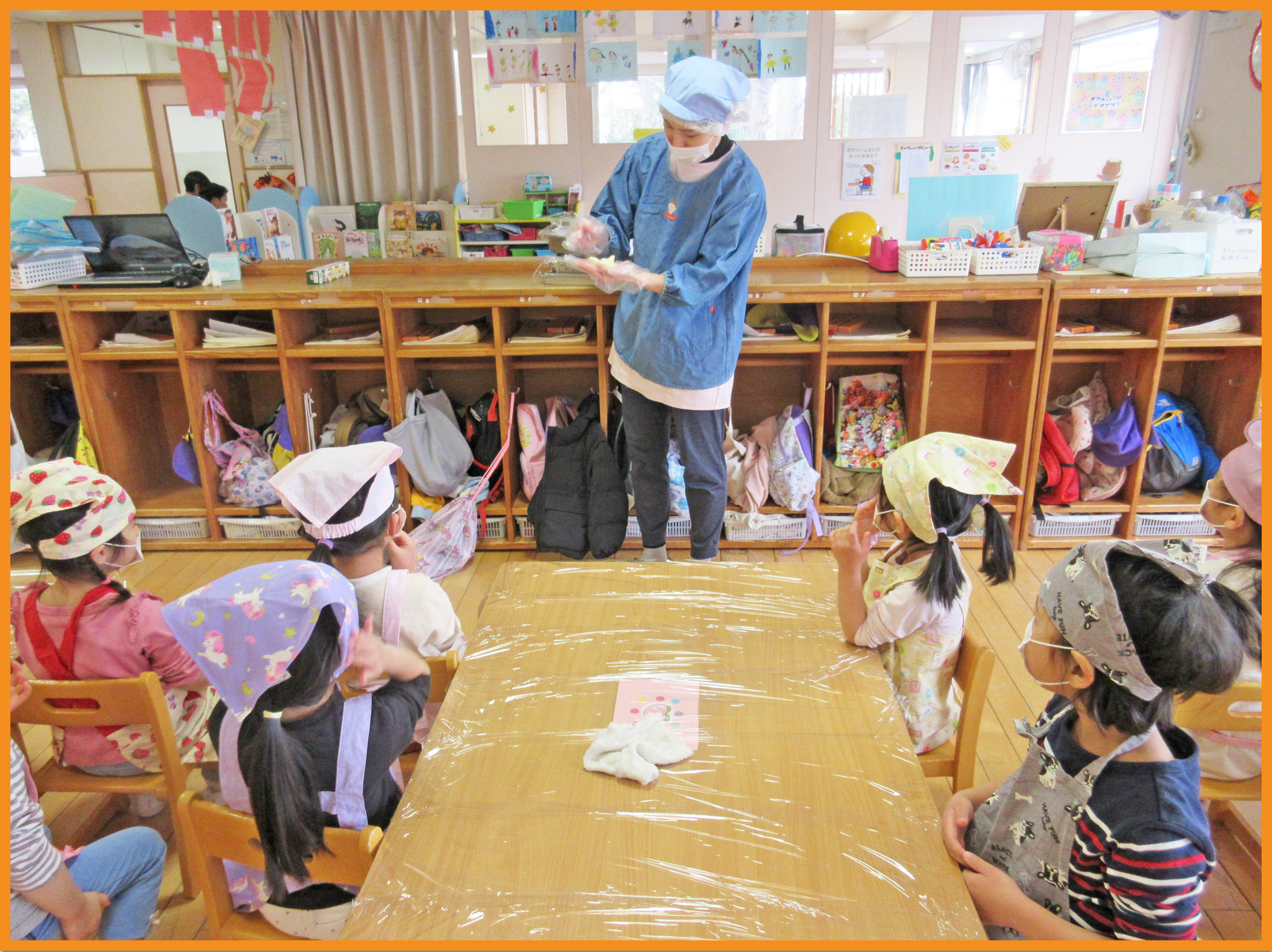 食育でパン作りを行いました。「しょくパン」「くまくまパン」と何のパンを作るかをみんなで話し、とても楽しみにしていたこどもたち。給食の先生の話をとても真剣に聞いて取り組む姿がありました。