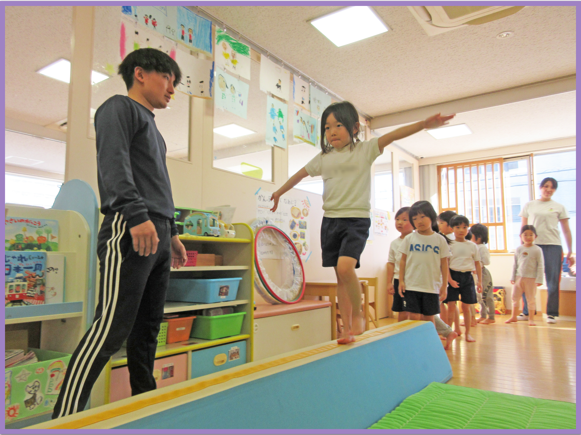 今日の体操教室は平均台を行い、両手を広げて線の上を歩いてみました。一歩ずつ慎重に進み「怖い」と言っている子もいましたが、数回一人で歩くことが出来ると自信がつき、怖がらずに進むことができました。