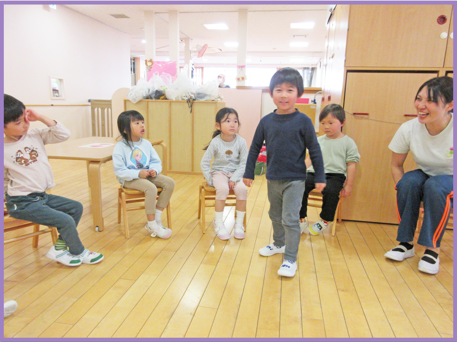 体操教室の後は、なんでもバスケットをしました。3回椅子に座れなかった人は、海の生き物の真似をするというルールで行いました。ジェスチャーゲームのように楽しんでいました。