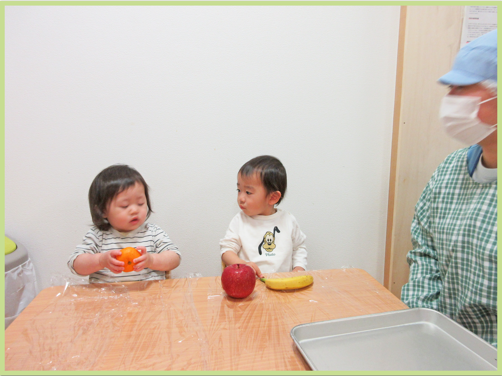 初めての食育活動がありました。食材がたくさん出てくる絵本を見ながら食育活動に対する期待感を高めていきました。給食職員が野菜や果物を持ってきて近くで見ると早速触ってみたり、持ち上げてみたり、匂いを嗅いでみたりと興味津々な様子が見られました♪五感を使った貴重な経験が出来、とても楽しそうなこどもたちでした。