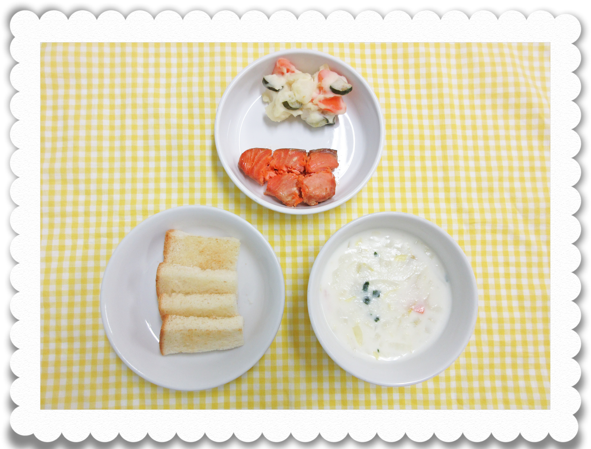 【幼児給食】バターロール、生鮭の照焼き、ポテトサラダ、白菜シチュー