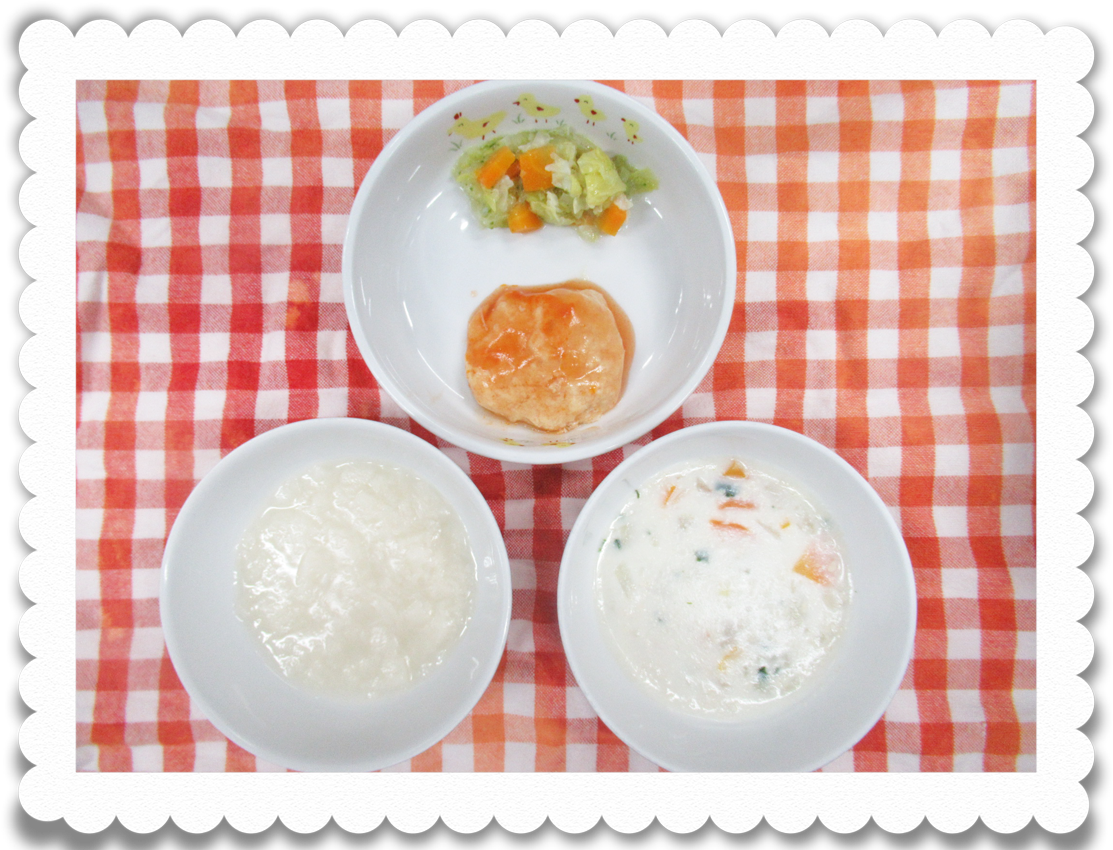 午前食:スープパン粥、煮込みハンバーグ、おろしあえ、クリームスープ