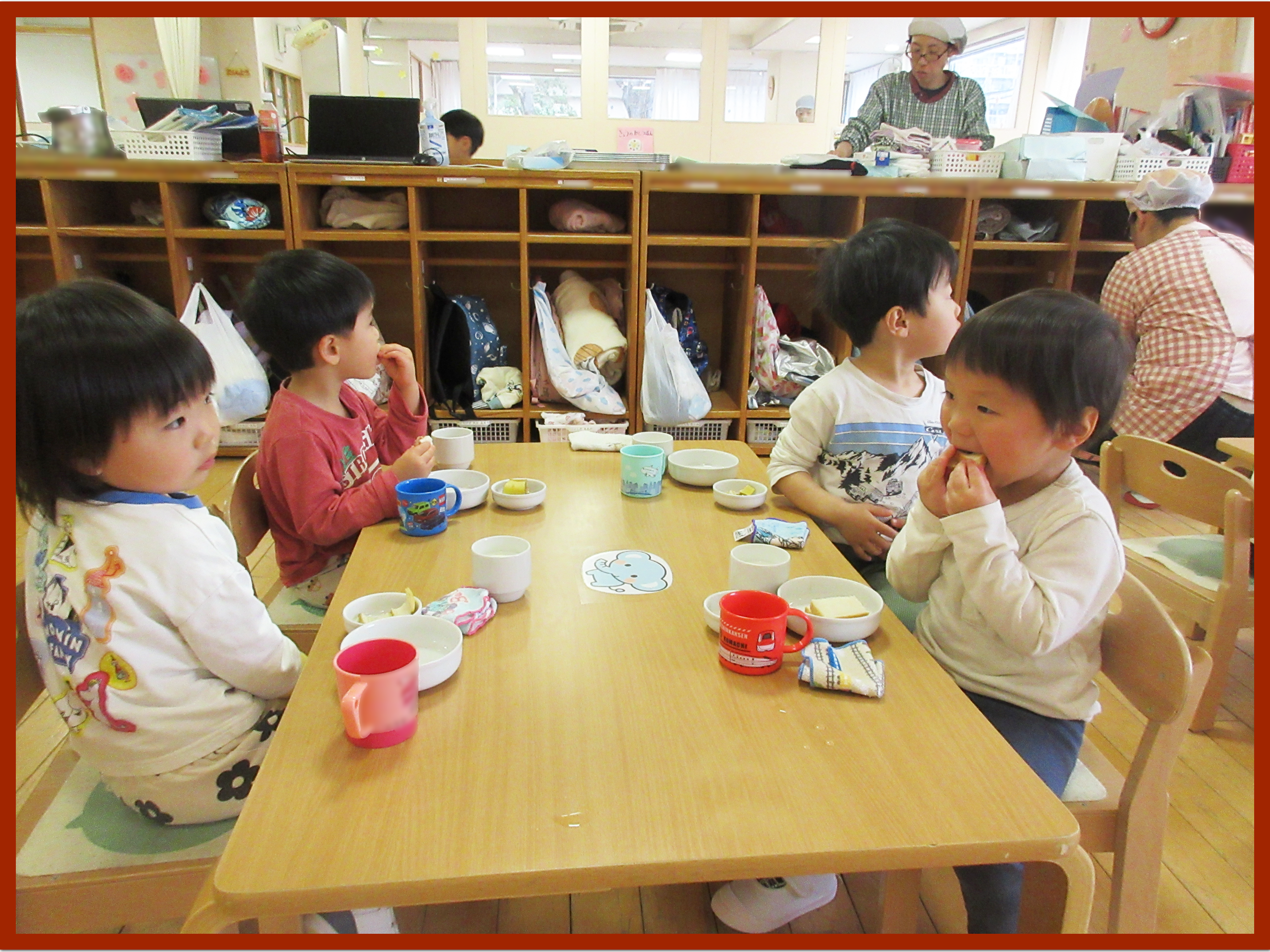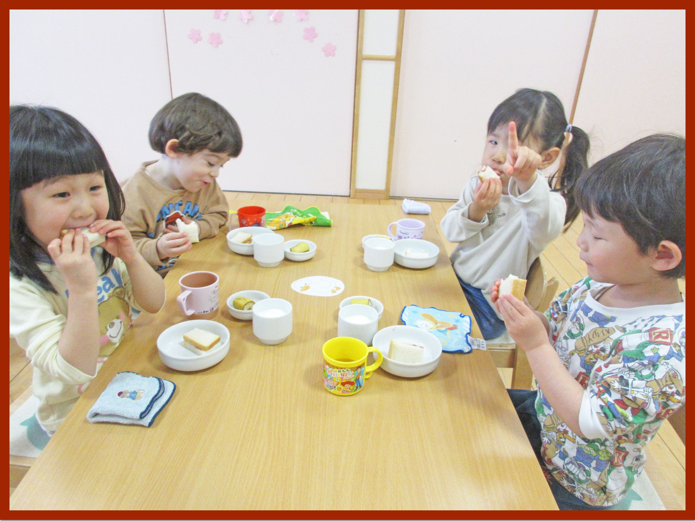 いちごジャムサンドを作りました。一つ目のパンにジャムを塗り、もう一つのパンに重ねていきます。「いちごジャム、たくさん塗ってもいい」と保育者に聞きながら、自分で上手に塗ることができました。重ねる時も優しく置くことができ、完成すると大喜び。自分で作ったいちごジャムサンドがとても美味しかった様子で、あっという間に完食していました.