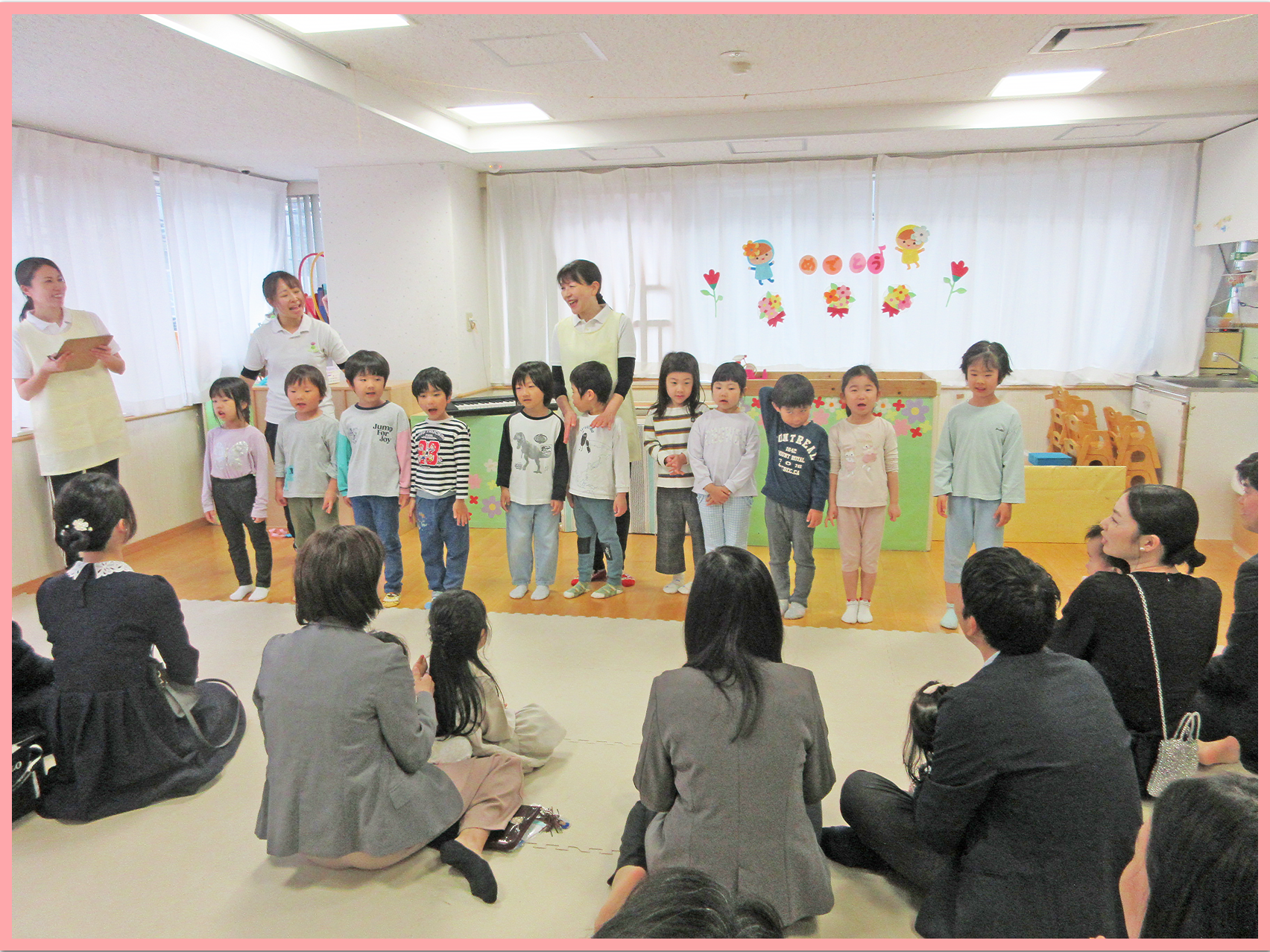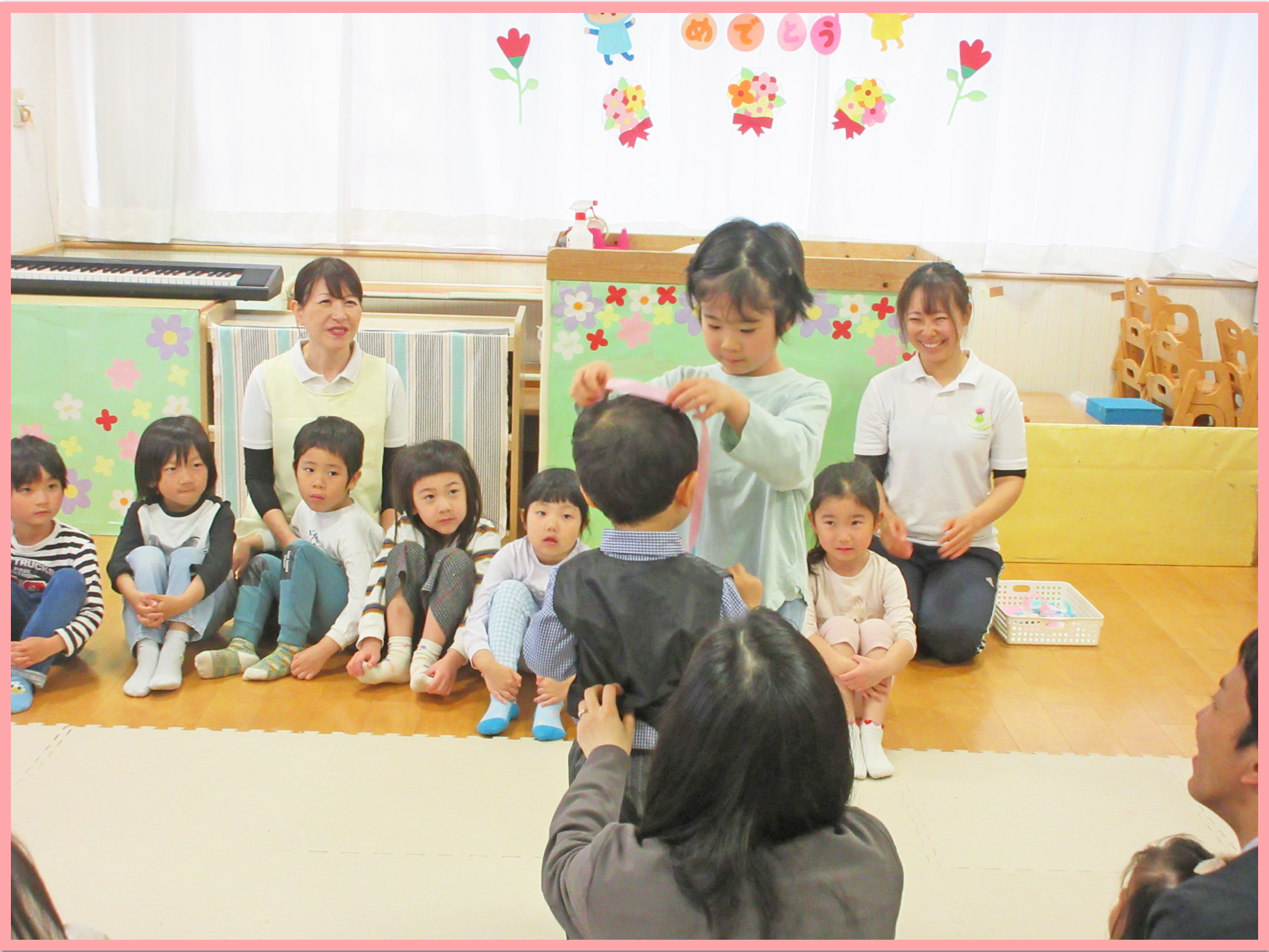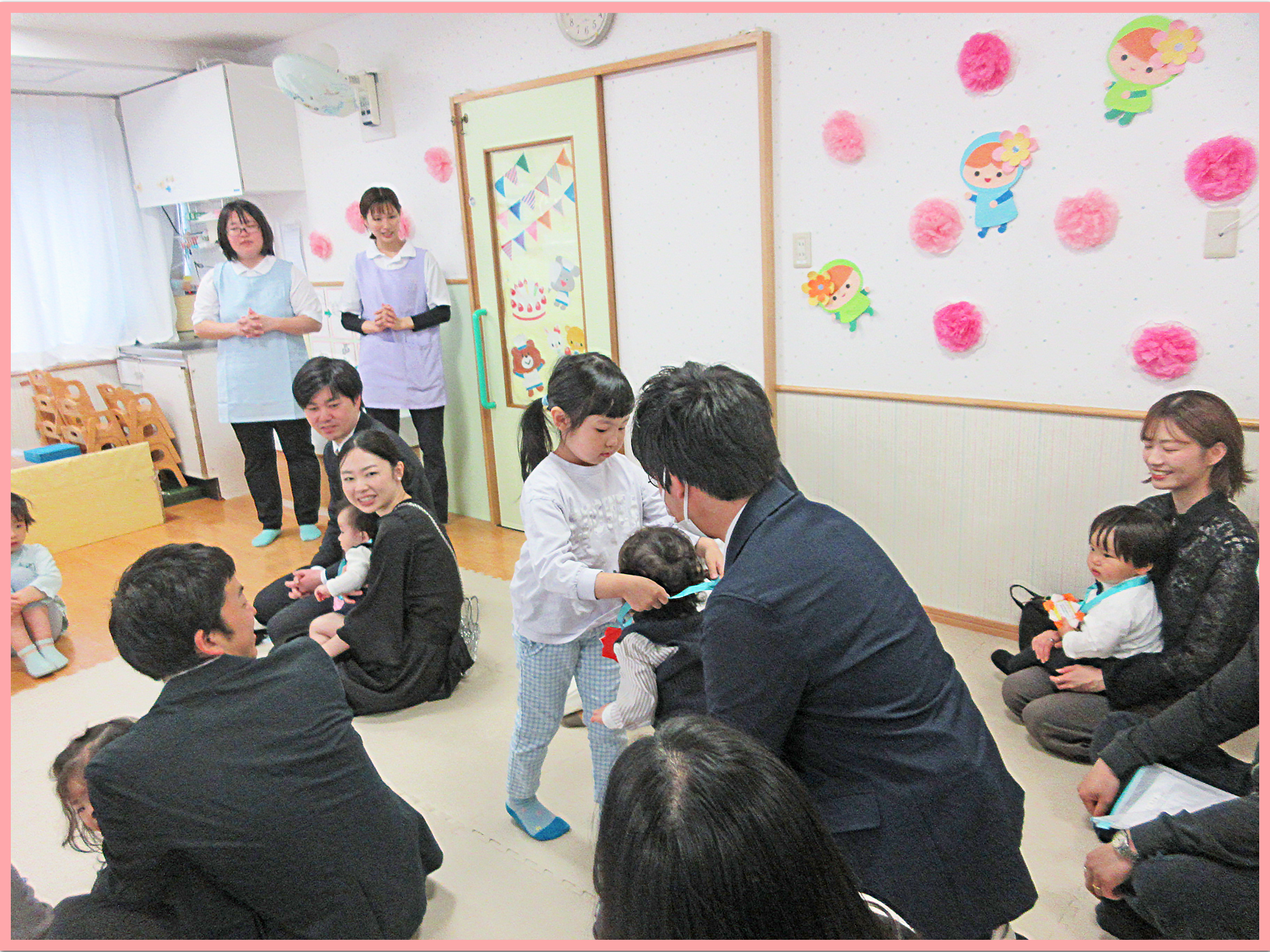 入園式では年長組のこどもたちが園歌や手遊びを入園したこどもたちに披露し、一人ひとりに手作りのメダルをプレゼントしました。