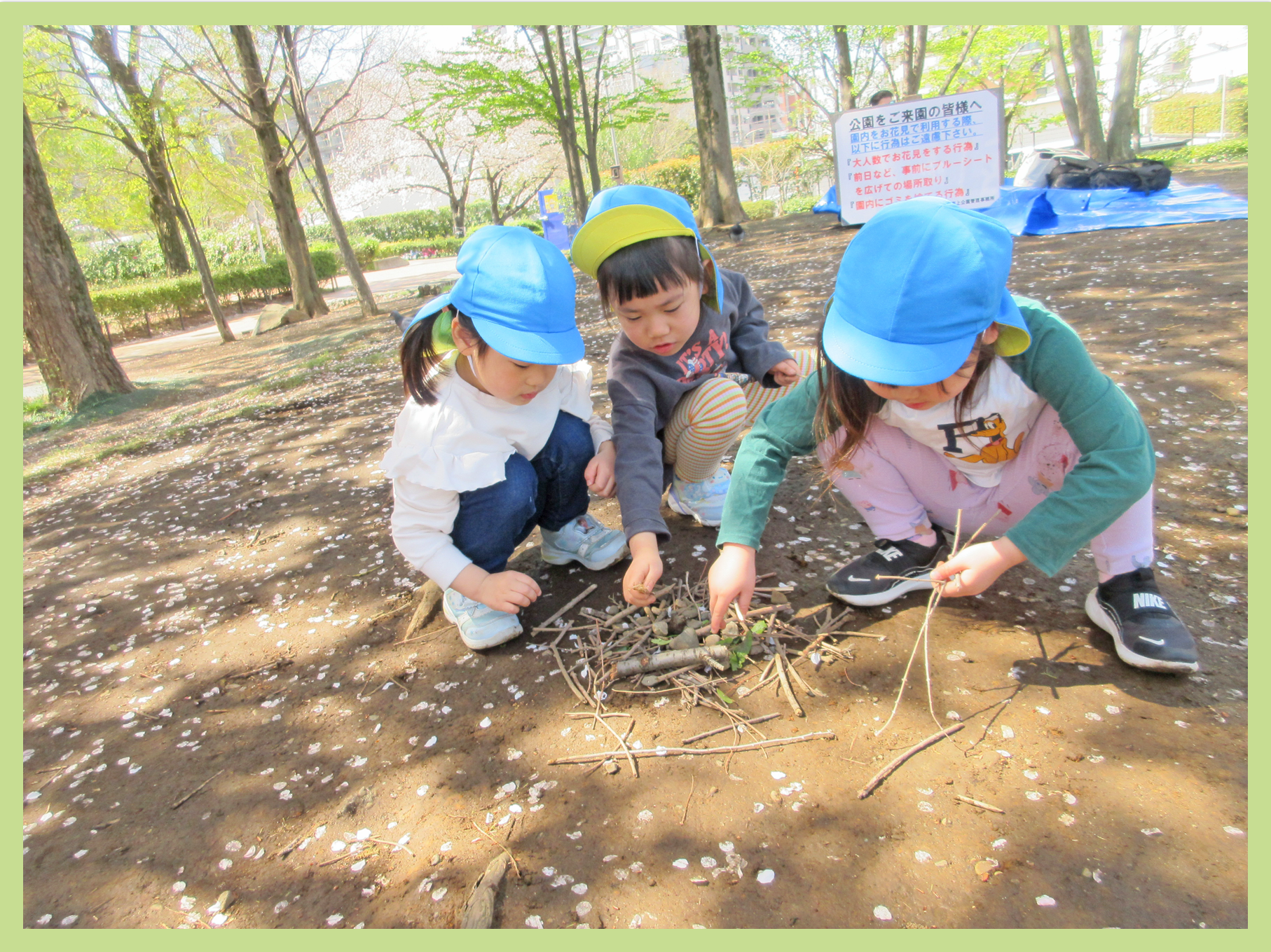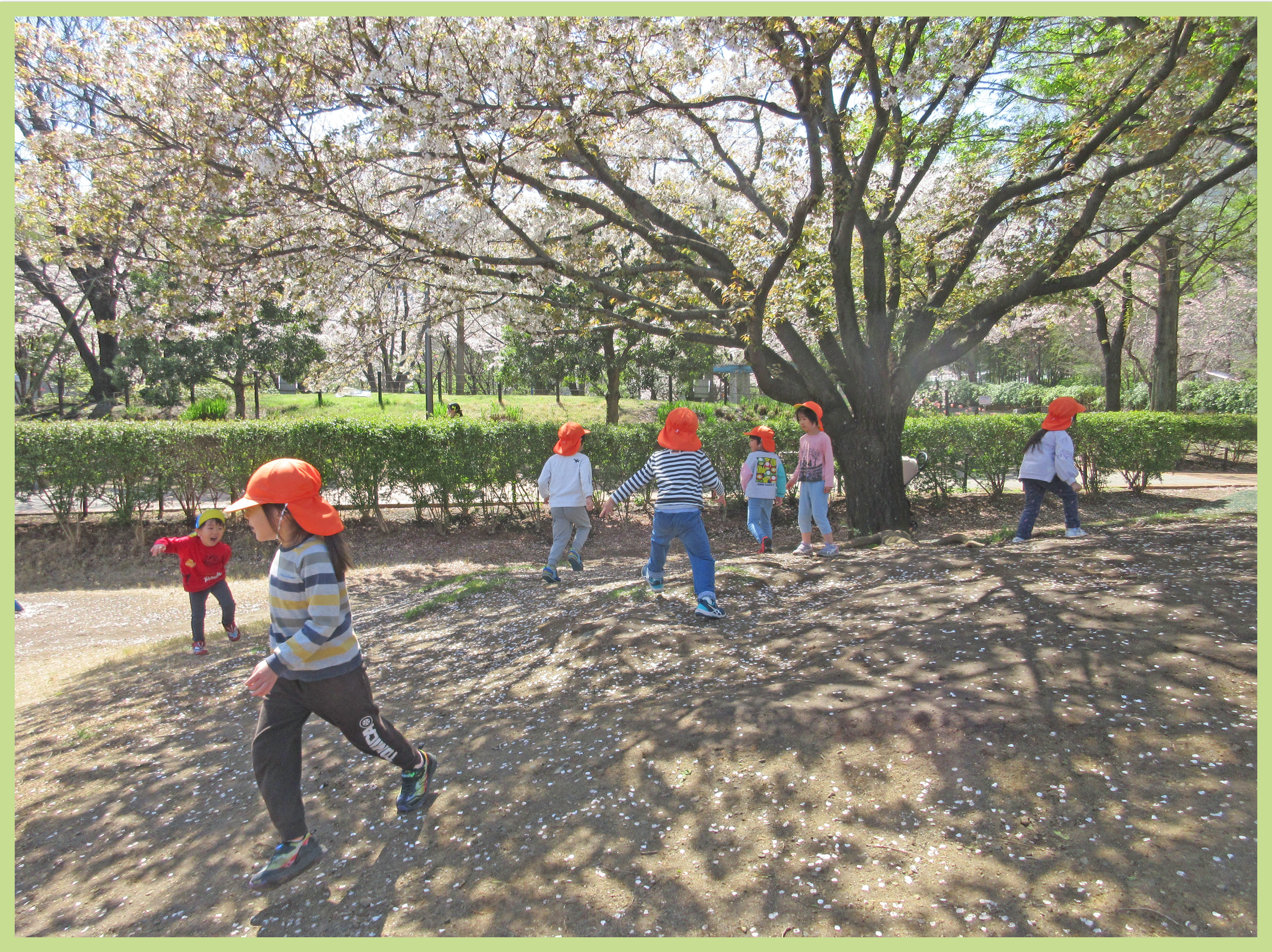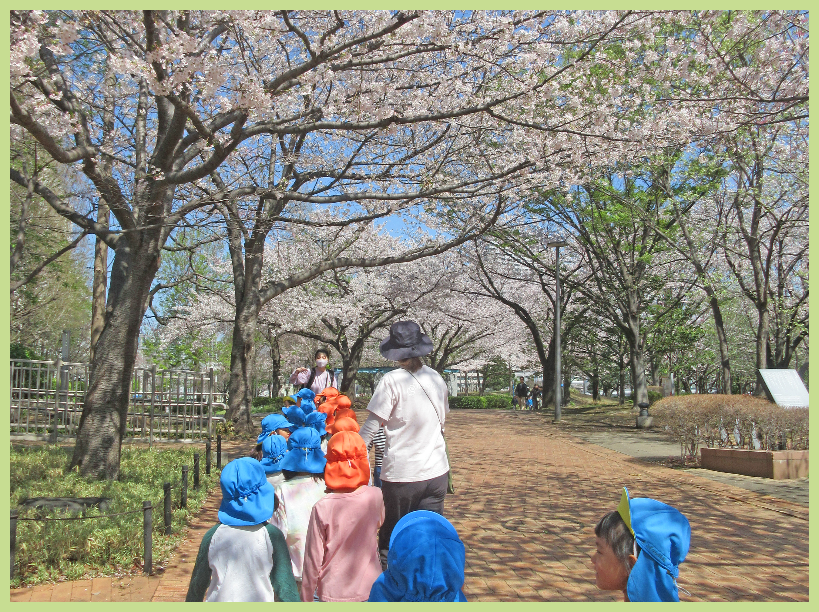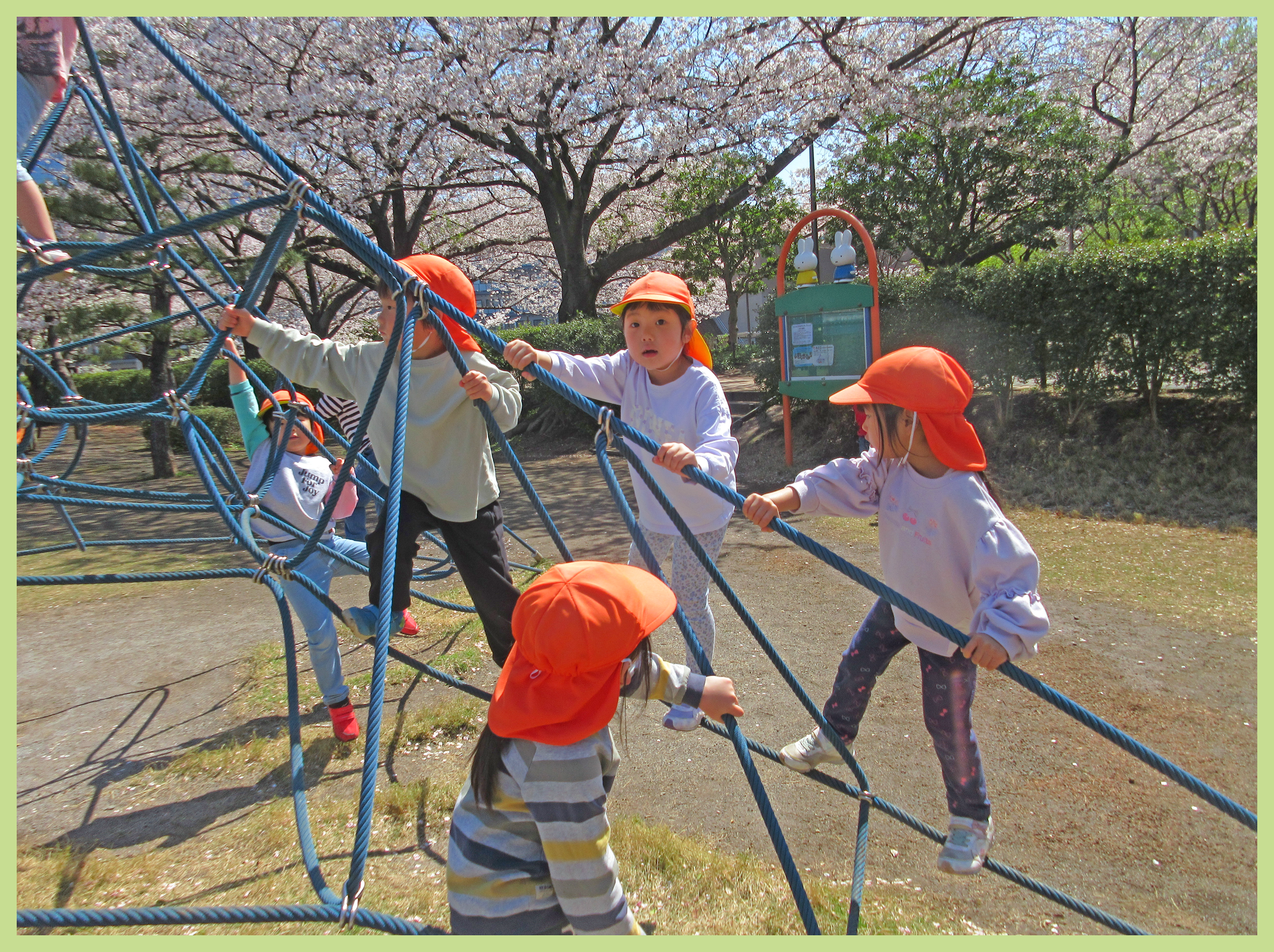 進級して初めての散歩に行ってきました。それぞれ進級したクラスの帽子を被ると自然と笑顔になるこどもたち。海上公園で、満開の桜を見たり、ロープのジャングルジムで遊んだり楽しんでいきました。蝶々や舞う桜の花びらを追いかける姿も見られました。