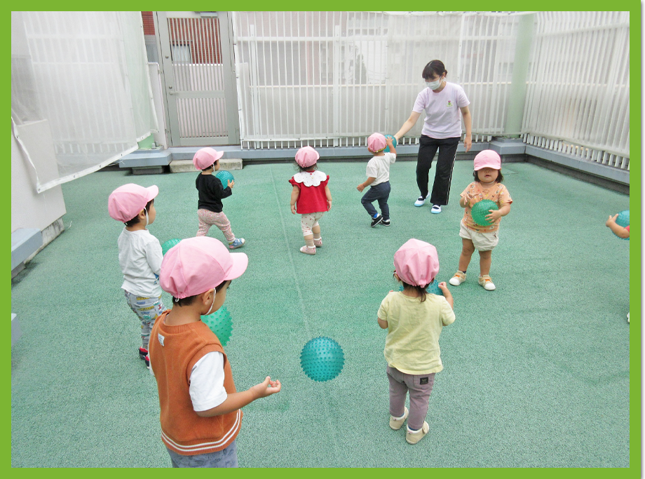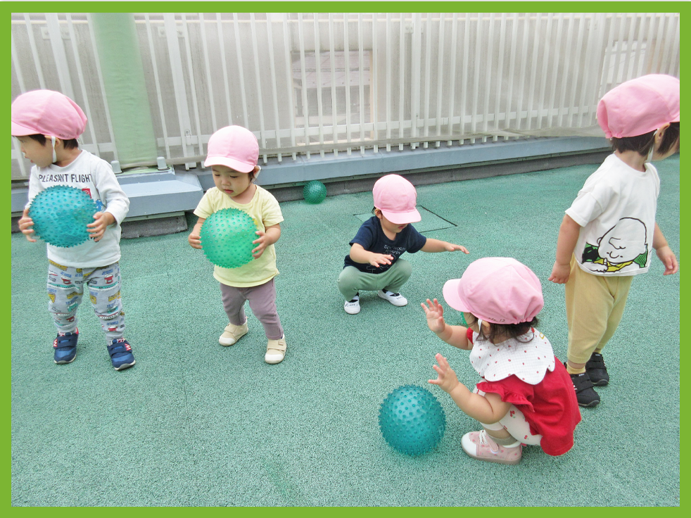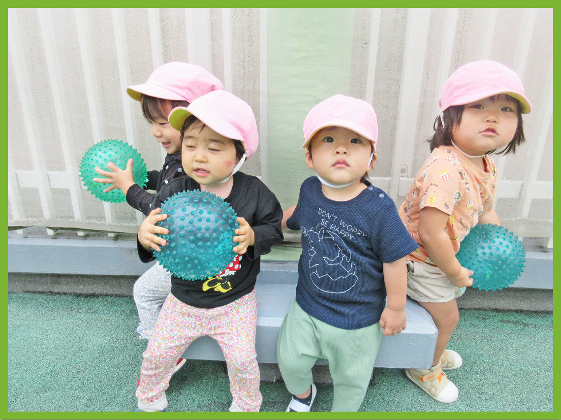 ボール遊びでは、いつの間にか両手投げから片手投げが出来る子が増え上手に投げては、保育者とキャッチボールを楽しみました。
