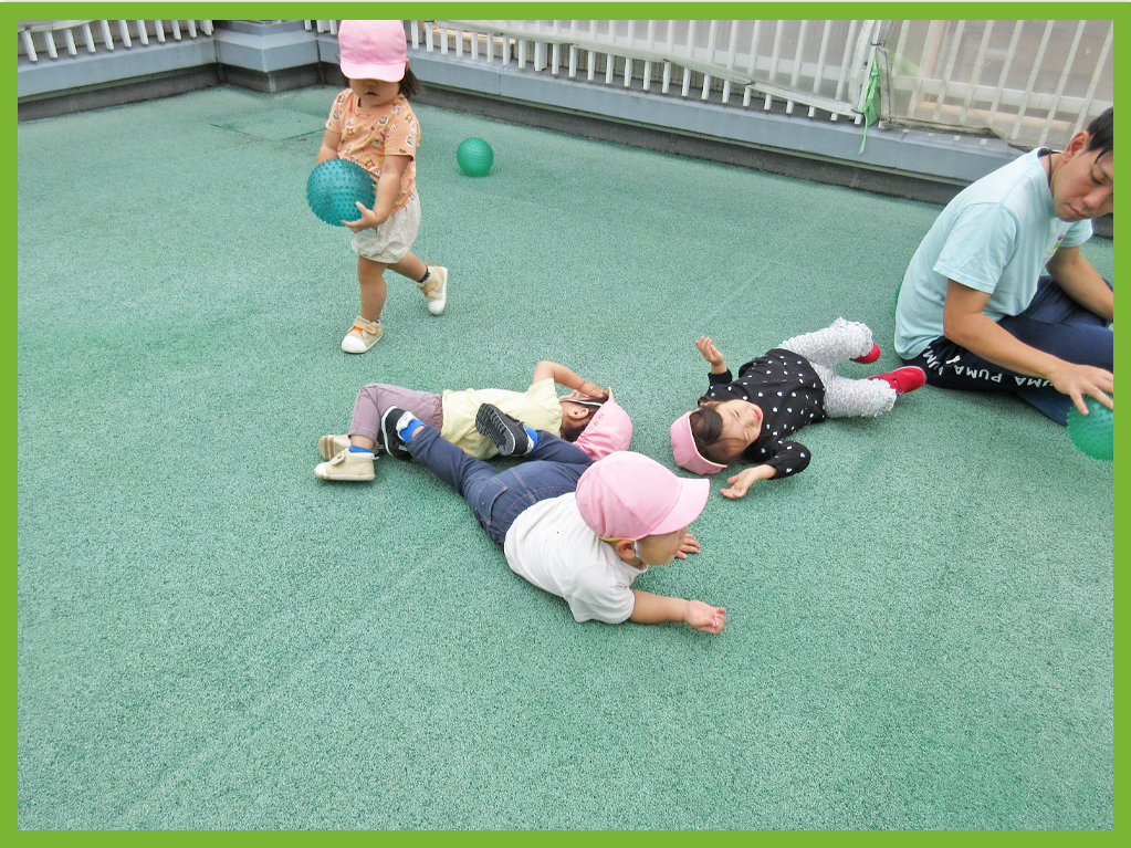 今日は初めて屋上で遊びました。屋上に行くと広い場所で大喜びのこどもたち。