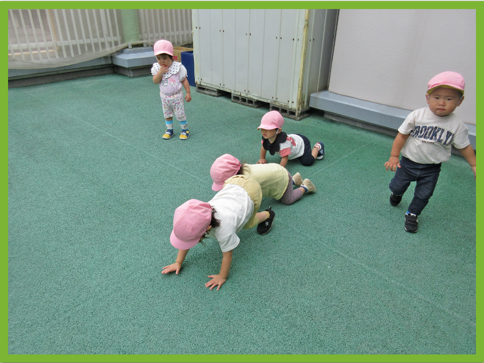 最後はみんなでかけっこを行うと、動物の歩き方の真似をして沢山体を動かしました。