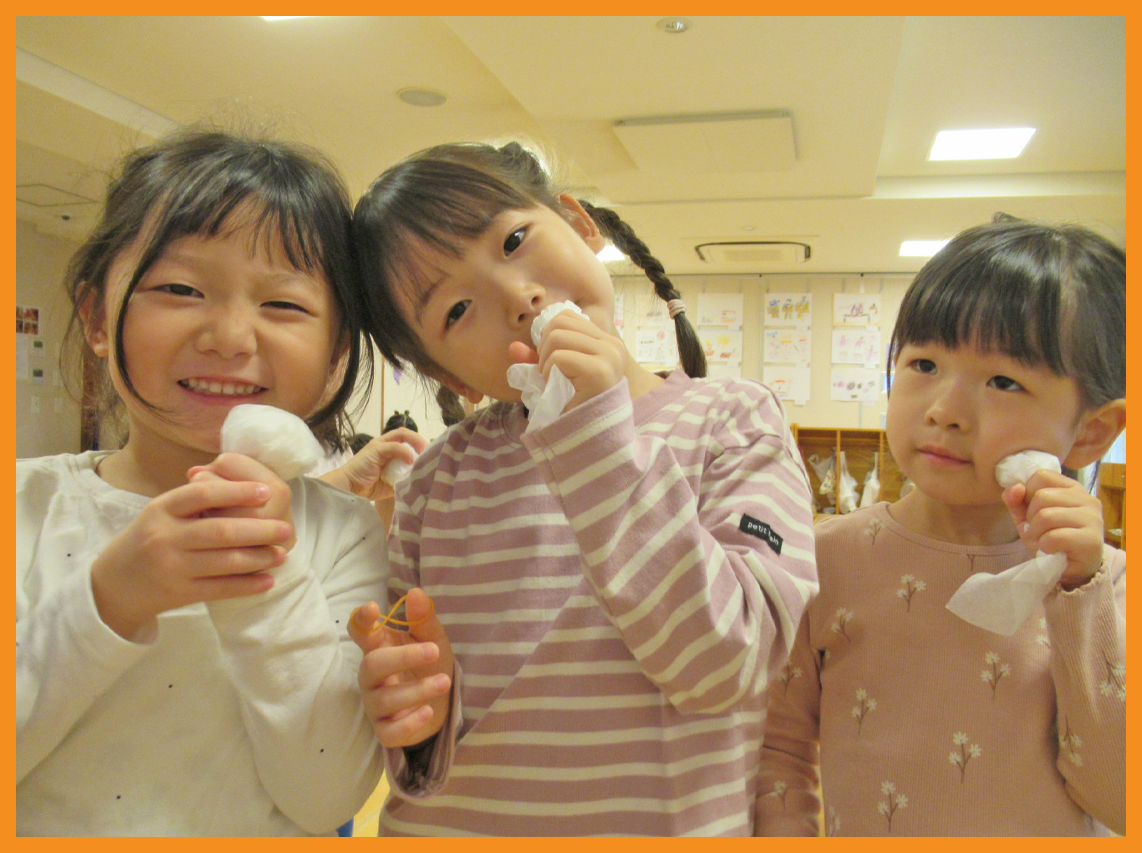 朝の会では明日の園外保育(芋ほり)の話をすると、こどもたちから「みんなで てるてる坊主を作るのはどうかな」という声が聞こえてきました。そこで、急遽こどもたちのリクエストに応えて『てるてる坊主づくり』をすることに!!