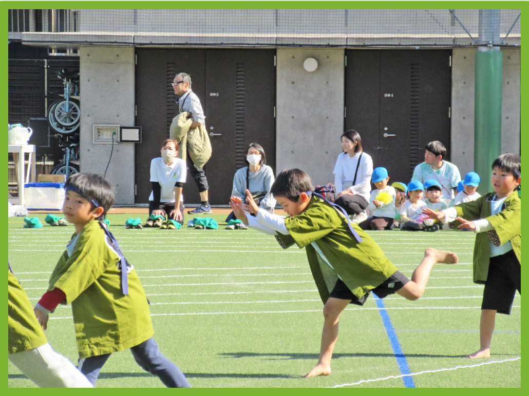 5歳児かぶとむし組は開会式の鼓笛、リレー、組体操、ソーラン節と様々な競技を行いました。リレーは白熱した試合となり、会場中が大盛り上がり!大きな声援の中走るこどもたちの姿に感動し、胸が熱くなりました。組体操、ソーラン節はくりのき保育園の5歳児が毎年行っている恒例の演目です。リレーとは打って変わり、会場中が集中してかぶとむし組さんの勇姿を見届けました。くりのき保育園の年長児らしい姿に他クラスのこどもたちも憧れを抱いたと思います。