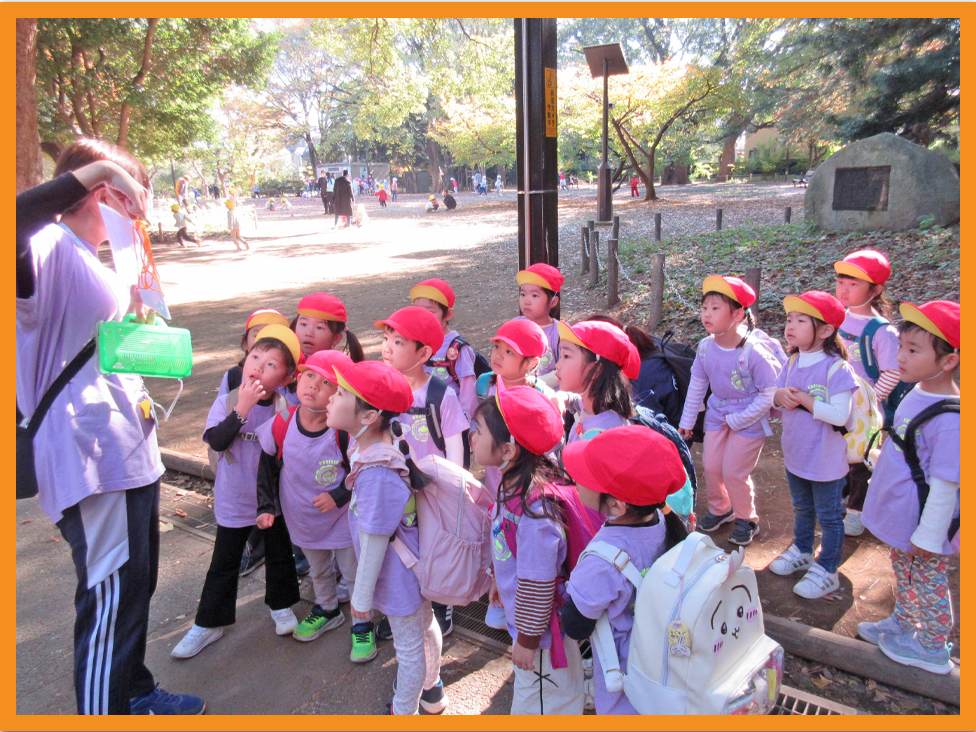 大自然に囲まれた公園では、普段なかなか見つけることの出来ないような木の実などの生前物を見つけることができ、大満足のこどもたちでした。今年度の園外保育も残り1回となりました。園外保育を通して様々な経験が出来ますように!