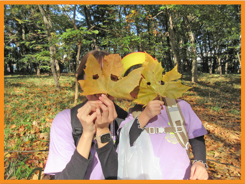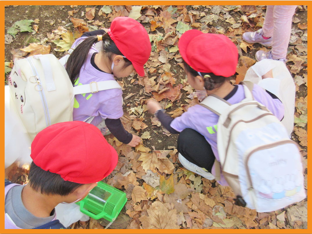 公園に着くと、さるすべりの木や大きなクスノキを発見!さるすべりという名前の由来や大きなクスノキはみんなが生まれる何年も前からあることを教えてもらい、またひとつ自然物への知識が増えたようです。その後は、保育者から出された自然物ミッションに挑戦しました。手のような形の葉っぱやドングリや松ぼっくりなどの秋の木の実などを見つけると「先生、あったよ!見てみて!」と発見したことを嬉しそうに話す姿が印象的でした。ミッション以外にも持ち帰る用の袋の中にお気に入りの自然物を入れると「じゃーん、これすごいでしょ!」や「あっちにあったよ、教えてあげる」とこどもたち同士でのやり取りも広がっていました。