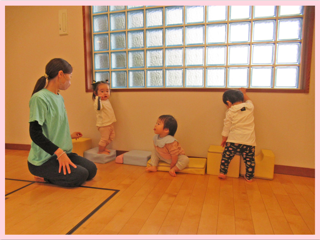 小さなマット山で遊んでいたありんこさんも今では大きな斜面のマット山もハイハイで勢いよく上って滑り降りて、保育者と手をつないで歩いて登ることもへっちゃらです。体全体を大きく動かして活動するようになりました。