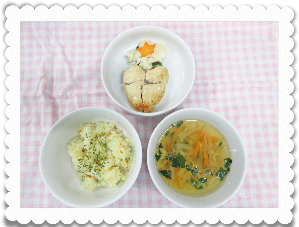 【幼児給食】 チキンピラフ、鶏つくね、ポテトサラダ、ジュリアンスープ