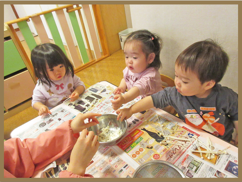 また、えのきちぎりでは真剣で集中した表情を見せ、手先を上手に使って取り組む姿があり、成長を感じる場面でした。
