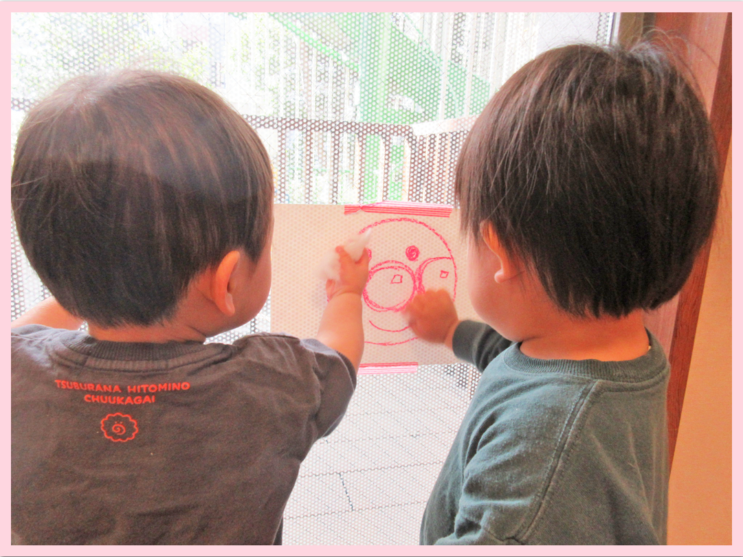 また、クレヨンで描いたイラストを「ごしごし」とこすり、白い綿に色をつけていく遊びも楽しみました。親しみのあるイラストを前に、色の名前やイラストの名前を何度も呼びながら楽しんでいました。