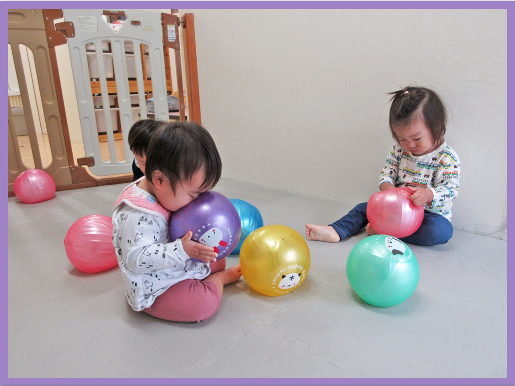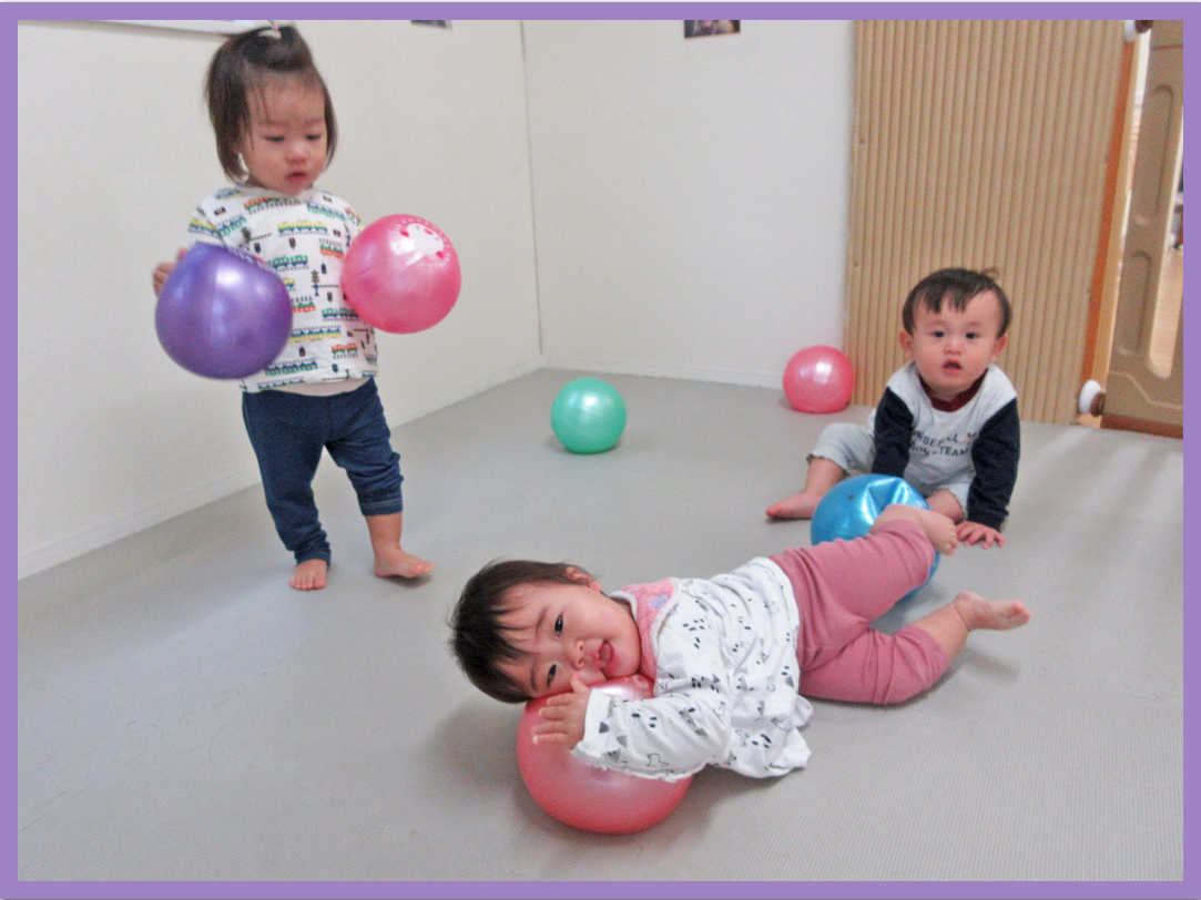 室内でボール遊びをしました。保育者がボールを見せると大興奮で集まってきたこどもたち。保育者の動きを真似してボールを投げて遊びボールの特性を生かして様々な遊び方を楽しんでいました。