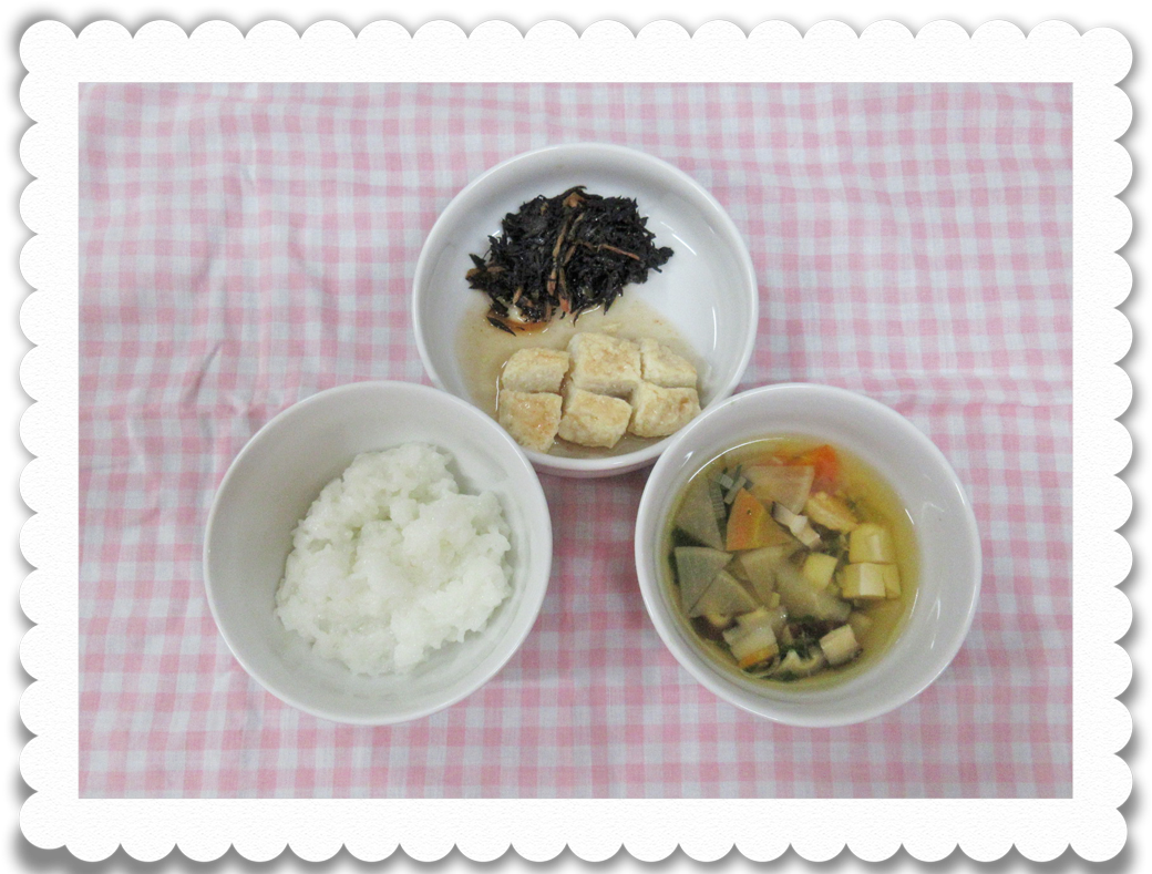 【乳児給食】ご飯、鶏肉のもみじ焼き、ひじきの炒め煮、のっぺい汁