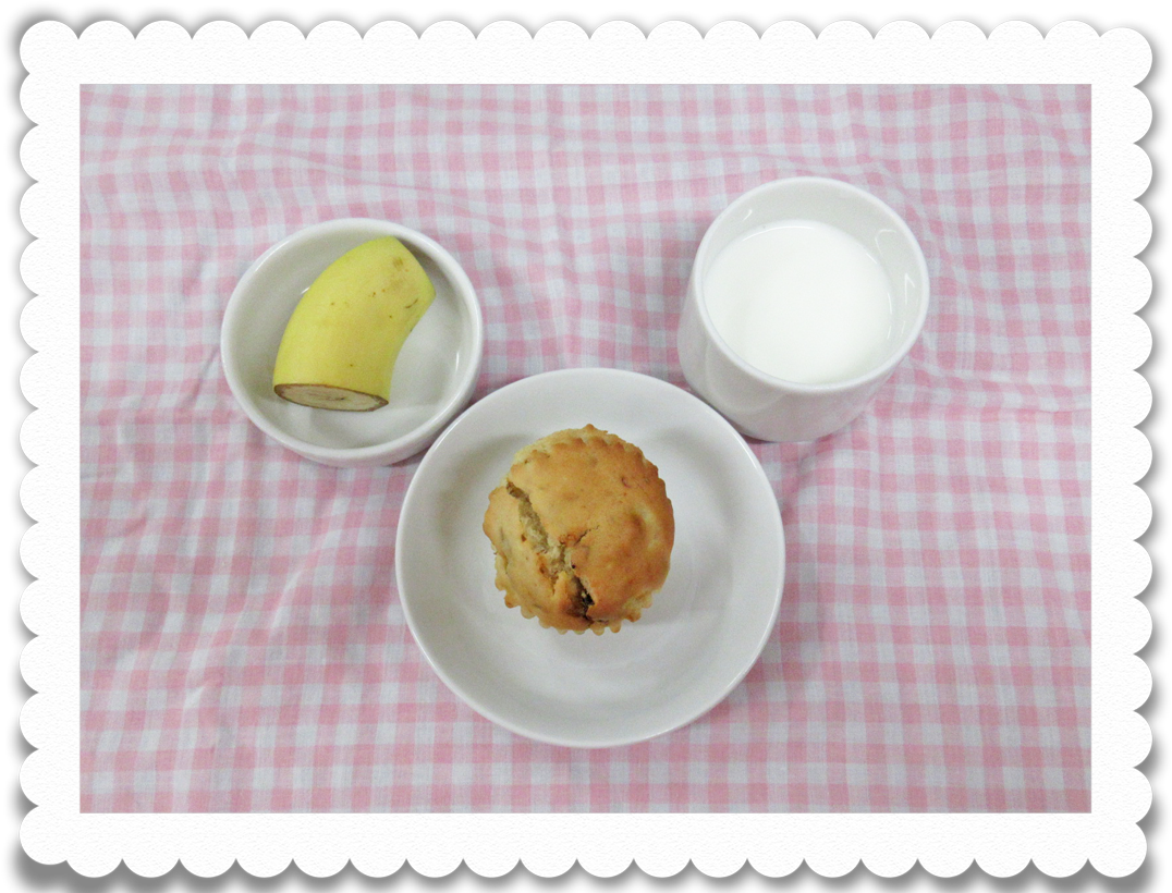 【乳児おやつ】牛乳、プルーンアップルケーキ、果物