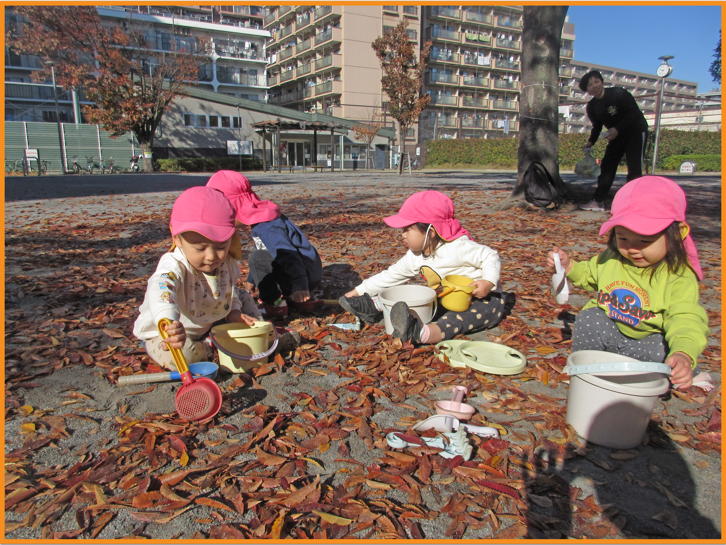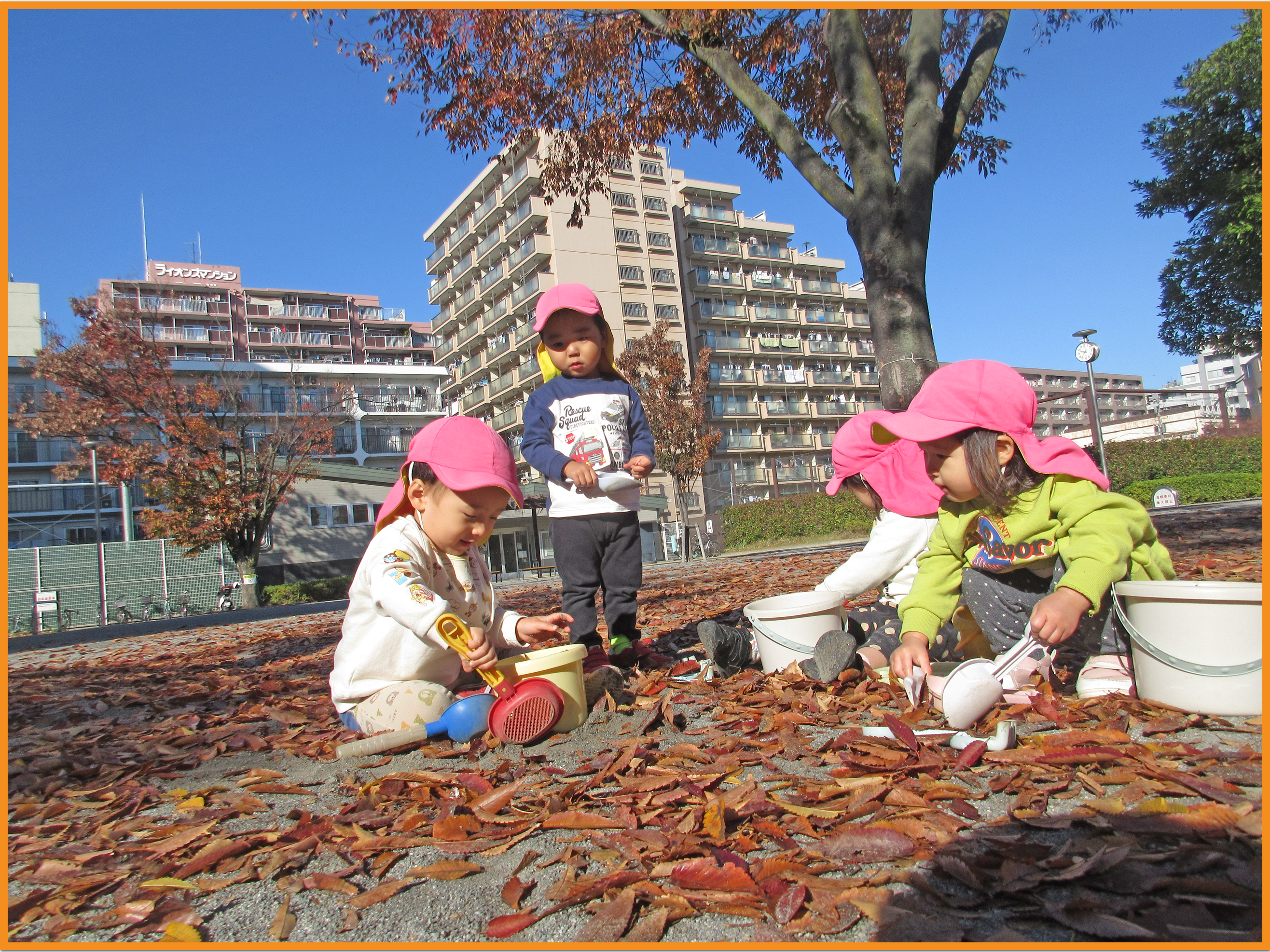 広場は葉っぱの絨毯ができていて、持ってきた砂場玩具で落ち葉を集めて、