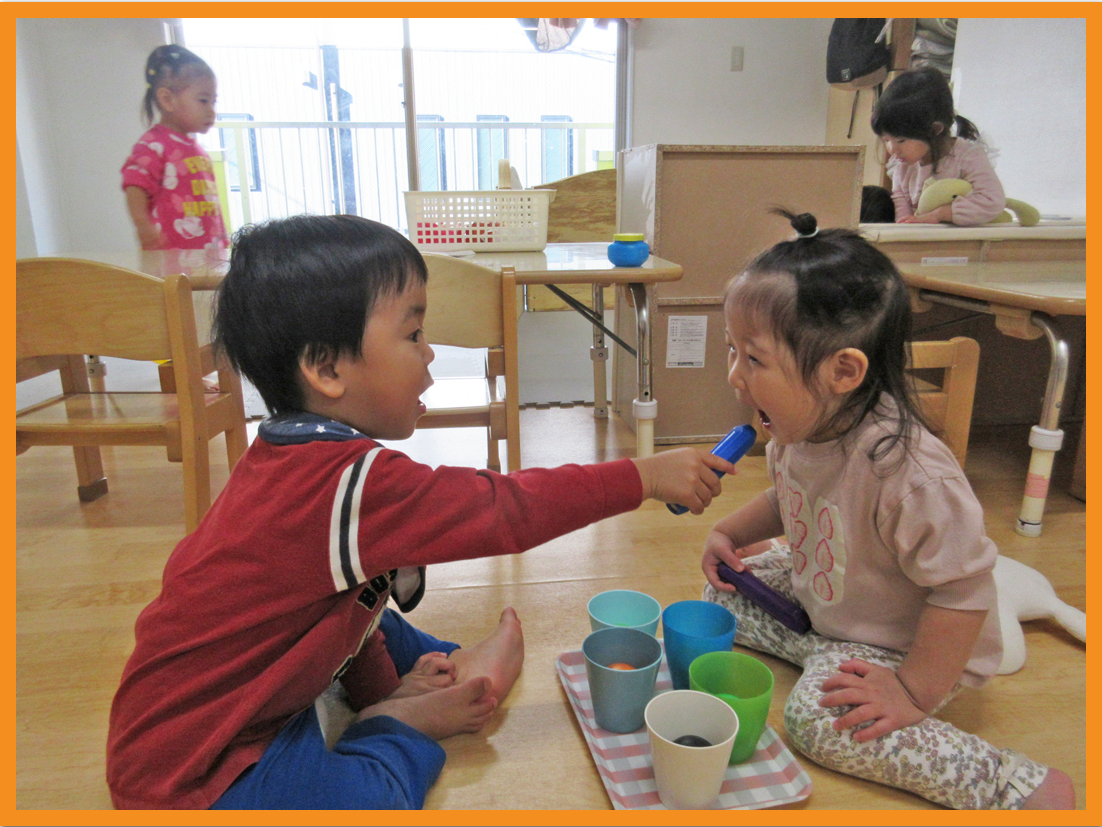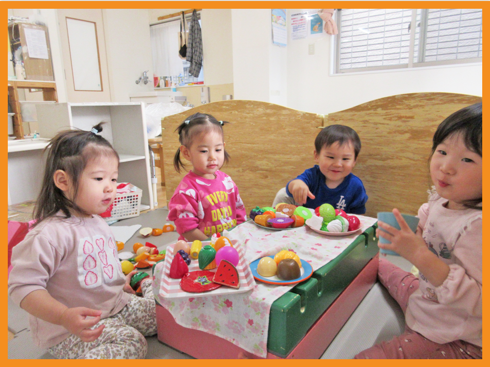 ままごと遊びの楽しさに気づいてきたようで、机を囲んでみんなで乾杯をしたり、ご飯を食べたりしています。