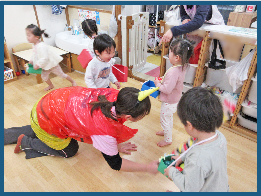 その後は、2歳児さんが鬼になって0,1歳児のお部屋に登場。