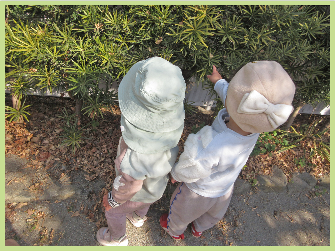 砂場遊びでは、ひよこ組さんはあひる組さんが遊ぶ様子をじっと見つめながらまねて遊んだり、公園内の植物を見に探索活動しました。緑の葉の一部が黄色に色づいているところを指さしで一生懸命伝えてくれる姿が見られました。