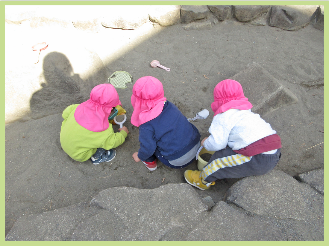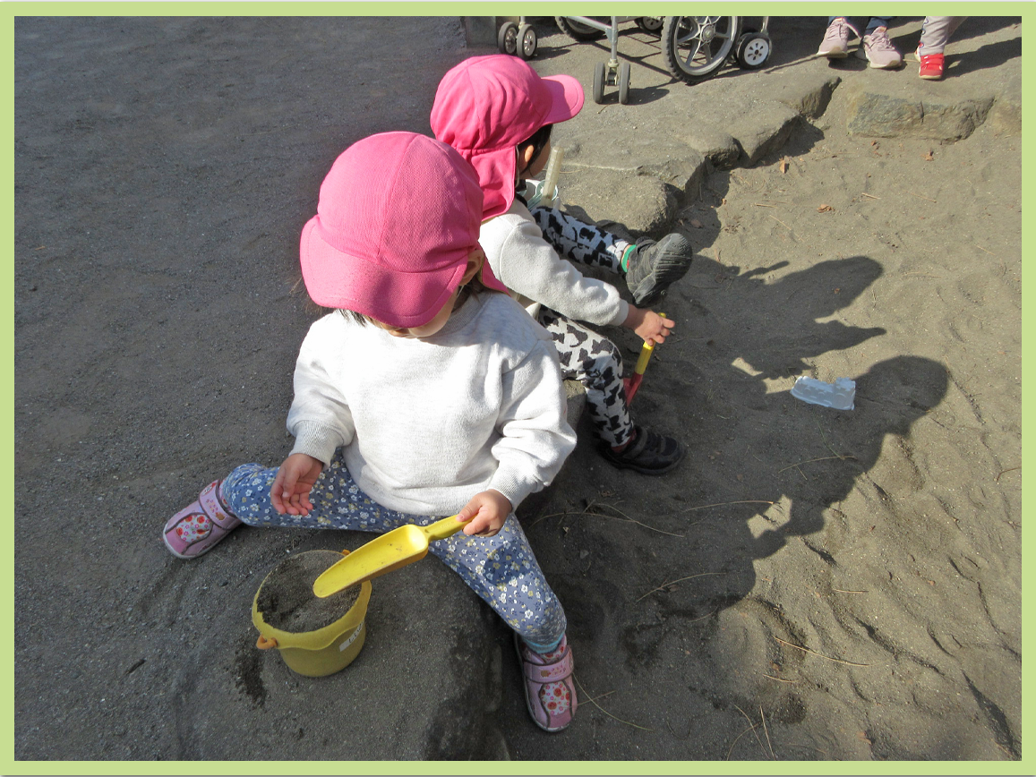 あひるぐみさんは友だちと一緒に砂場でクッキングしたり、自分の創造力を活かしてごっこ遊びをするなどして思い思い遊ぶ姿が見られました。また一緒にお散歩しましょうね。